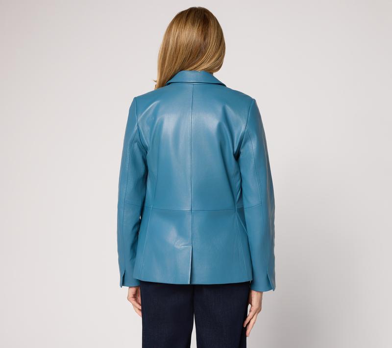 Tailored with a timeless two-button silhouette and classic lapel, this lamb leather blazer brings the wow-factor whether you're wearing it at the office or on a weekend outing. Dress it up with trousers for a meeting, or wear it over a T-shirt and jeans when you want to elevate your casual style. It instantly makes any outfit look intentional and polished. From Denim & Co. Fashions.
