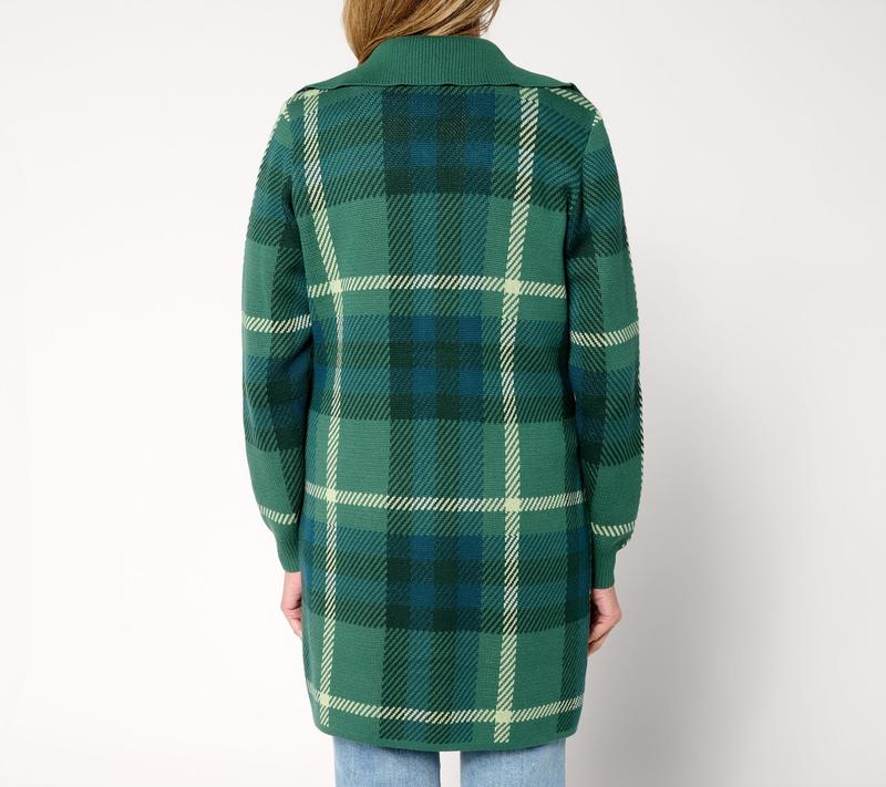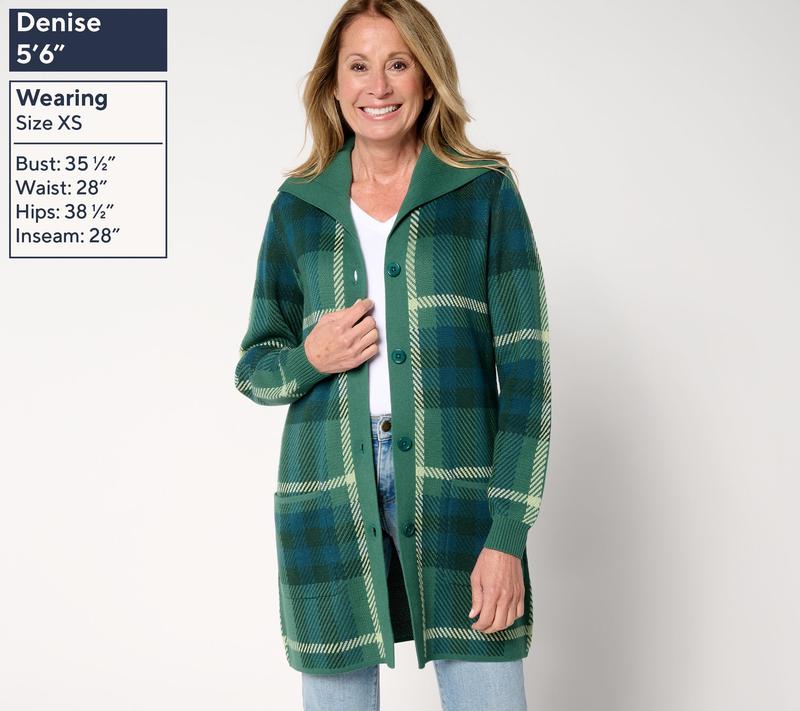 Denim & Co., jacquard sweater, all over plaid pattern that matches at the side seams, sleeves mirror, front patch pockets, 2"x2" rib collar w/ full needle, full needle center front placet, button-front closure, long sleeves w/ 2"x2" rib cuffs, straight bottom hem, petite length Legnth: 30 1/4"- 32 3/8". Plus Range: 32-3/4"-36-1/4". Fit: Semi-Fitted: Follows the lines of the body w/ added wearing ease. Content: 70% Cotton/30% Polyester. Care: MWC/DC/WWLC/ONCBWN/LFTD/CIIN/ODC. COO: Imported. (F).
