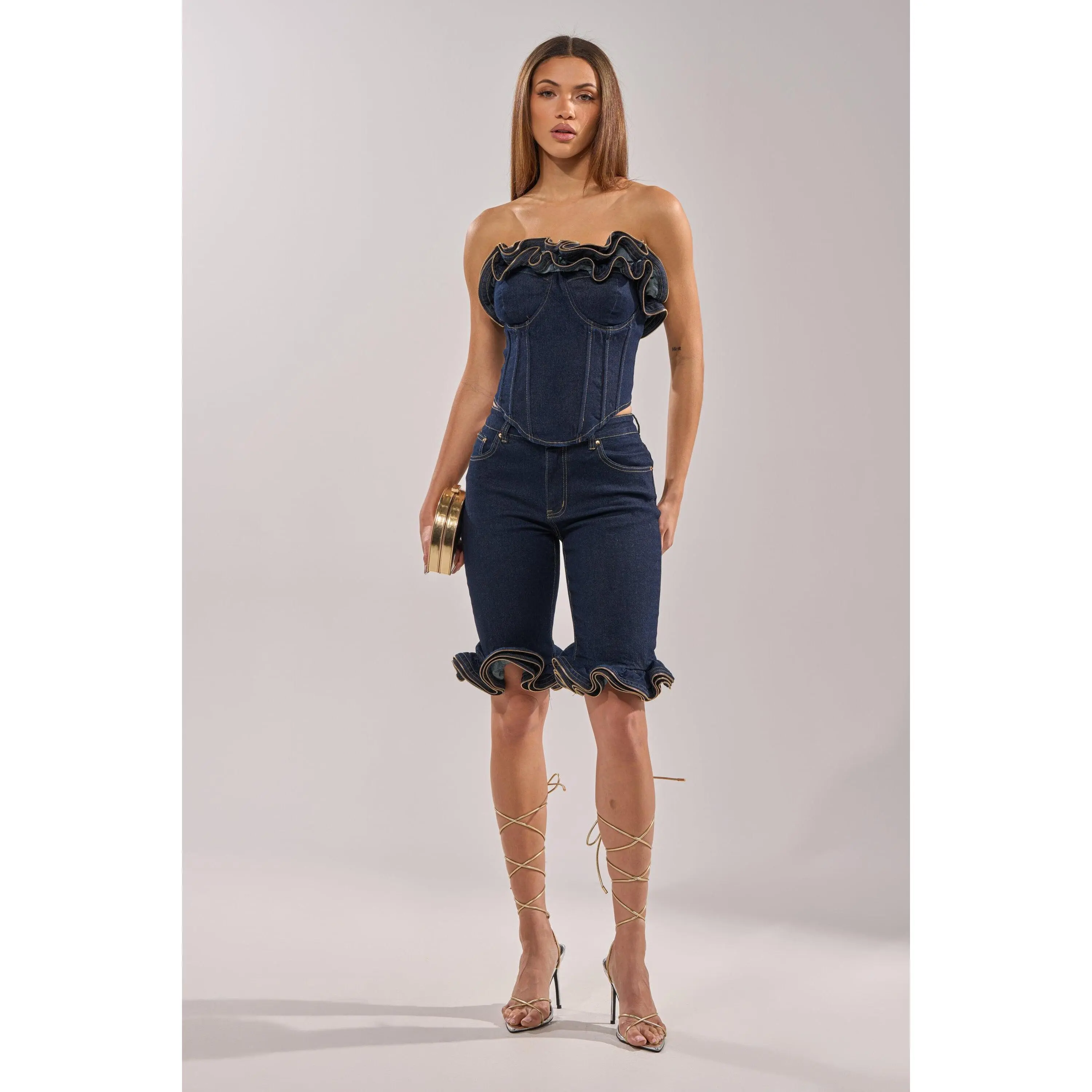 Anything but average. The AKIRA Label Something Different Denim Corset with Zipper Detail is crafted in a deep blue wash and features a cropped, curve-hugging fit, pointed hem, internal structural boning, a back zipper closure, and an exaggerated, ruffled neckline trimmed with bold contrast stitching and decorative zipper accents. Complete your look with the coordinating Something Different Denim Bermuda Short and Western boots.- 78% Cotton, 21% Polyester, 1% Spandex- Some Stretch- Imported(all measurements approximate from size small)- 15” Chest to Hem- Model is 5’9” and wearing a size smallProduct ID: 1048565(all measurements approximate from size 1X)- 17” Chest to Hem Product ID: 1048569