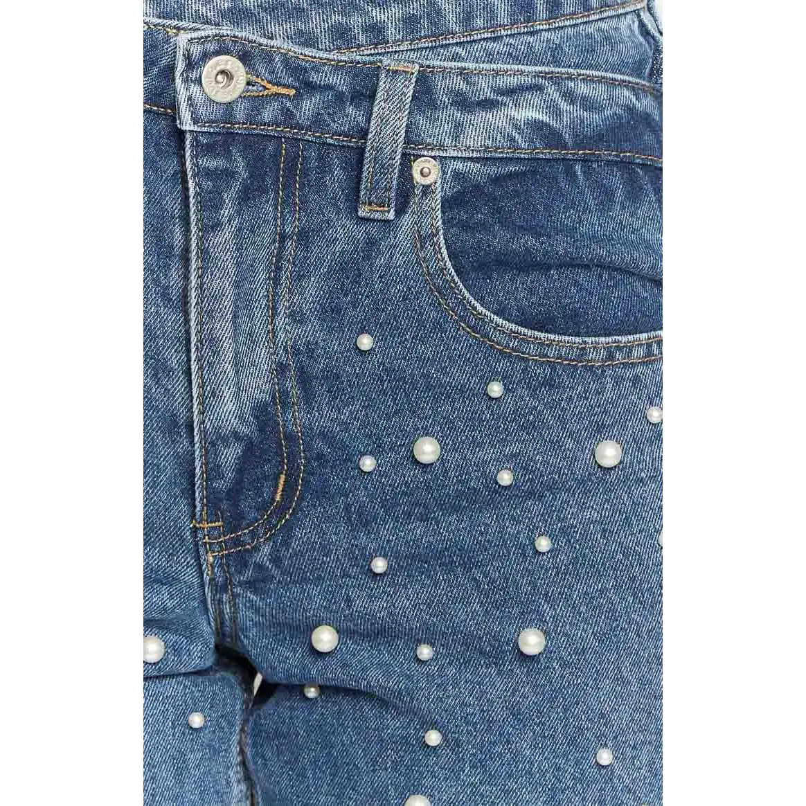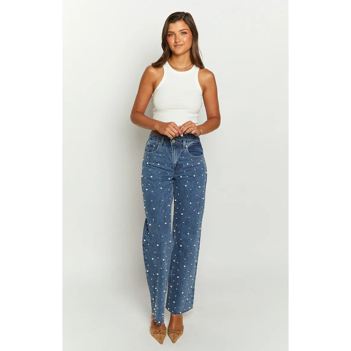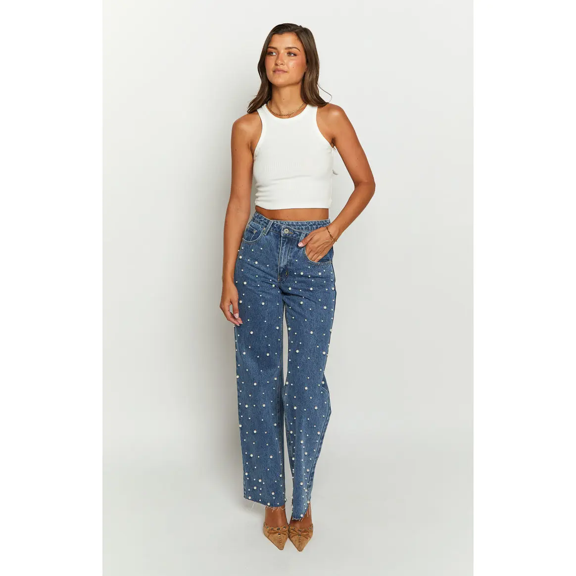 Denim Pearl High Wasted Jeans How to Style: Looks like we've got your next concert outfit sorted! The denim dazzle high wasted jeans are a staple piece alone. Pair with a white top and boots or heels for that comfortable festival fit! Features: