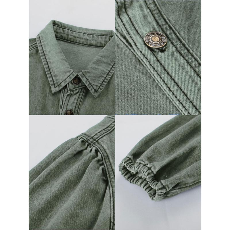 Features: Casual denim mini dress with twist, front buttons, lapel, long puffy sleeves, elastic cuffs, a breast pocket, cool contrasting seams, making it stylish and elegant for everyday wear.