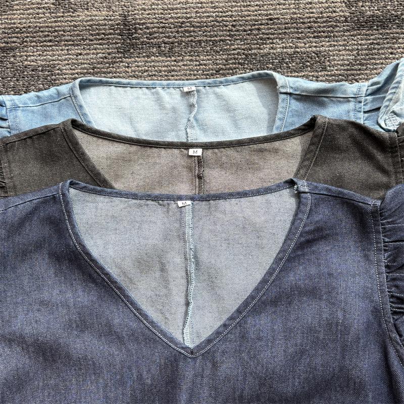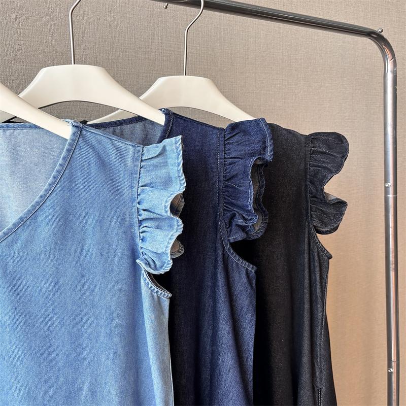 ·【STYLISH DESIGN】This women's maxi denim dress features ruffle trim on shoulders, sleeveless, v-neck, loose fit, a line silhouette and swing hem make this denim dress chic and trendy. This long denim dress is perfect for the woman who wants to keep charming all the time.
