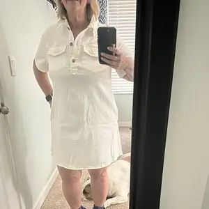 Received this dress super fast. It fits exactly as expected. Has great stretch around arms and all area we need stretching. The way the dress lays is perfect. I was skeptical at first because most denim dresses I have ordered with pockets, they look chunky and stick out. The pockets in this do not, you barely notice they are there. Material is thick enough you can’t see through it but not too thick for summer weather. It’s a perfect length. I’m 5’4 and it hit right at my knees hiding my upper legs completely. You can’t go wrong ordering this. *I open bag and tried it on wrinkled*