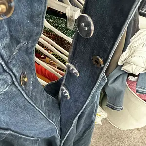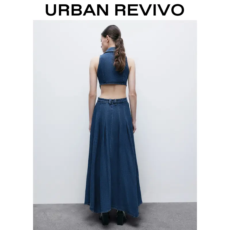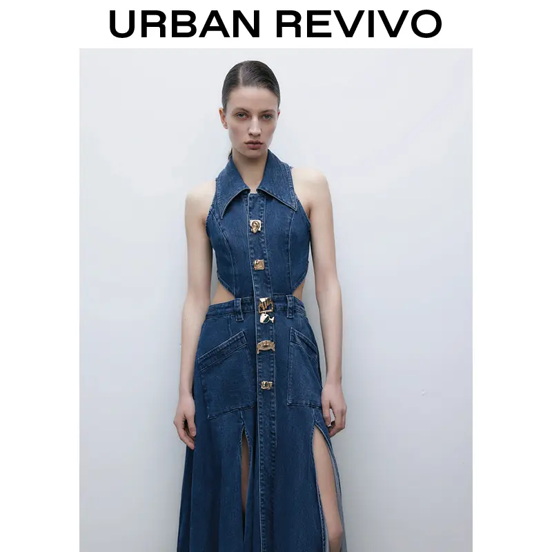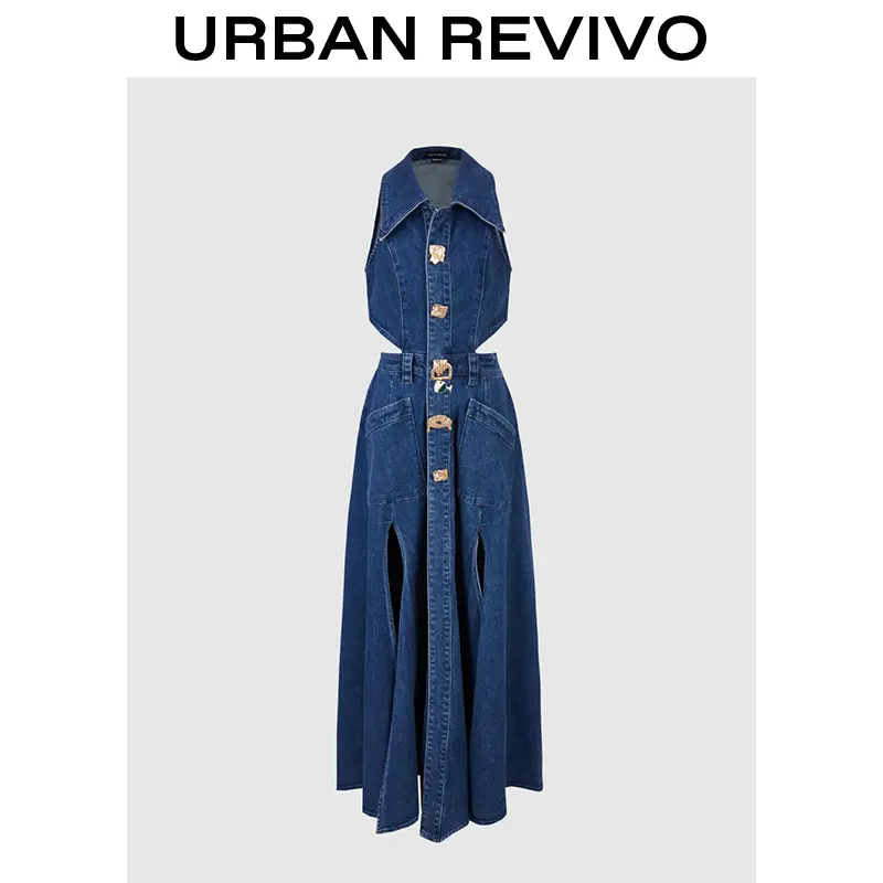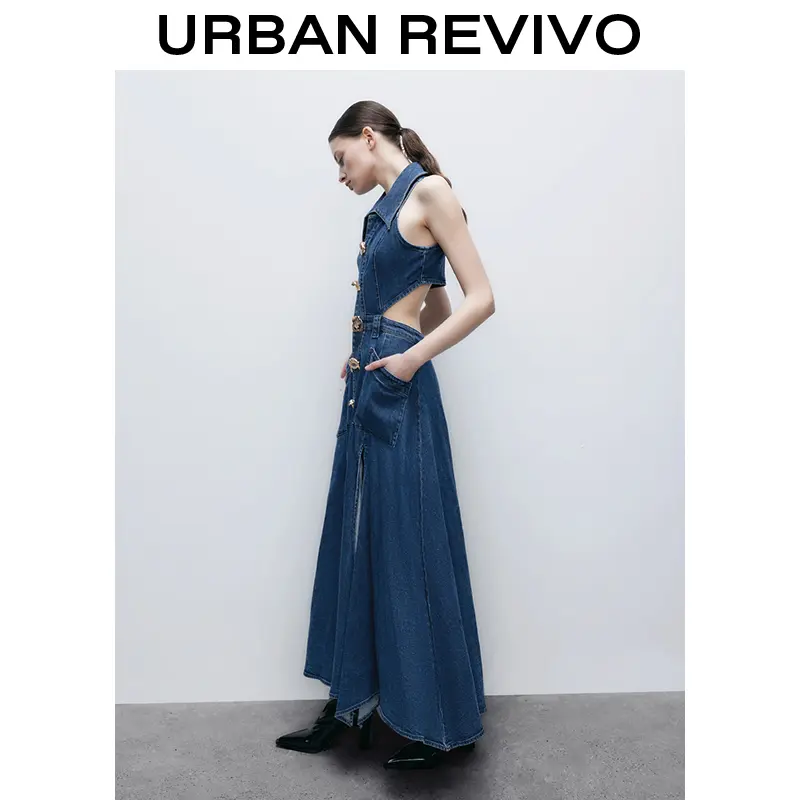 URBAN REVIVO Women's Casual Denim Dresses Fashion Lapel Sleeveless Cut-Out Sides Slit with Big Pockets UWG850170