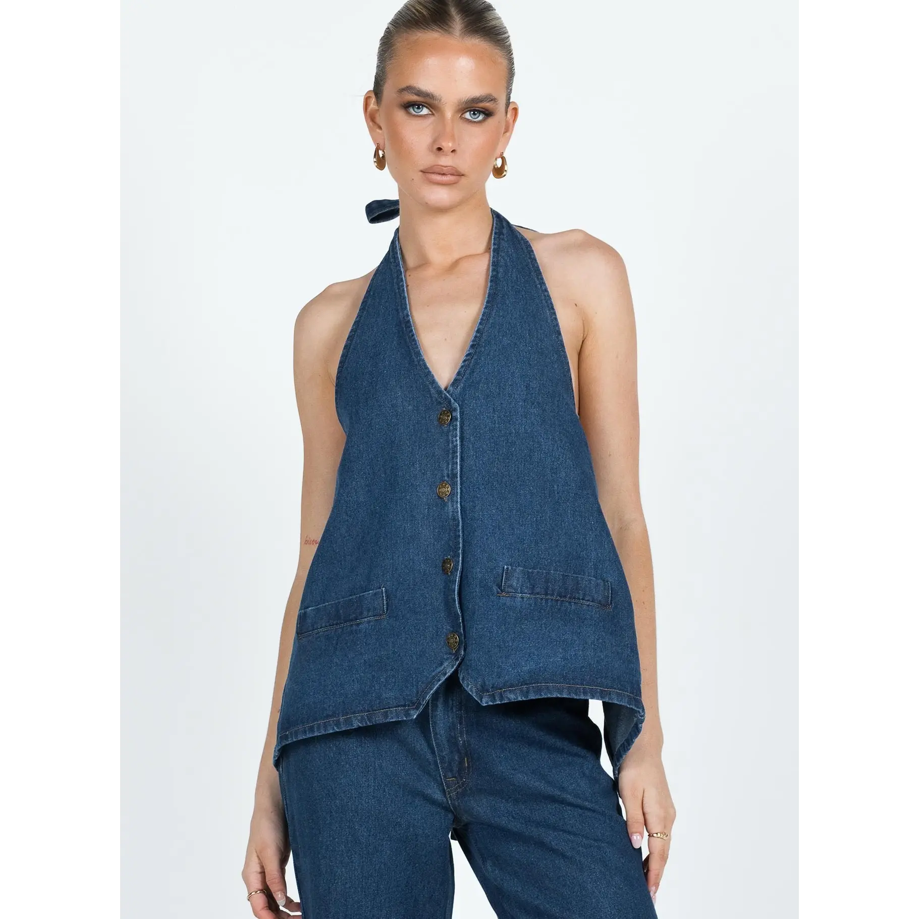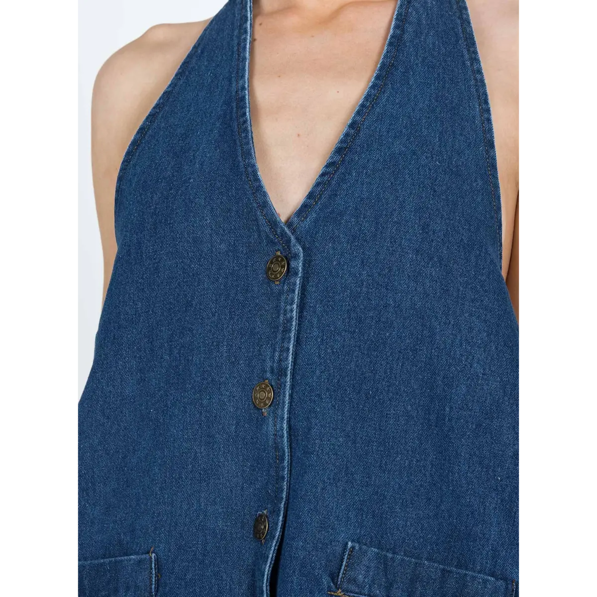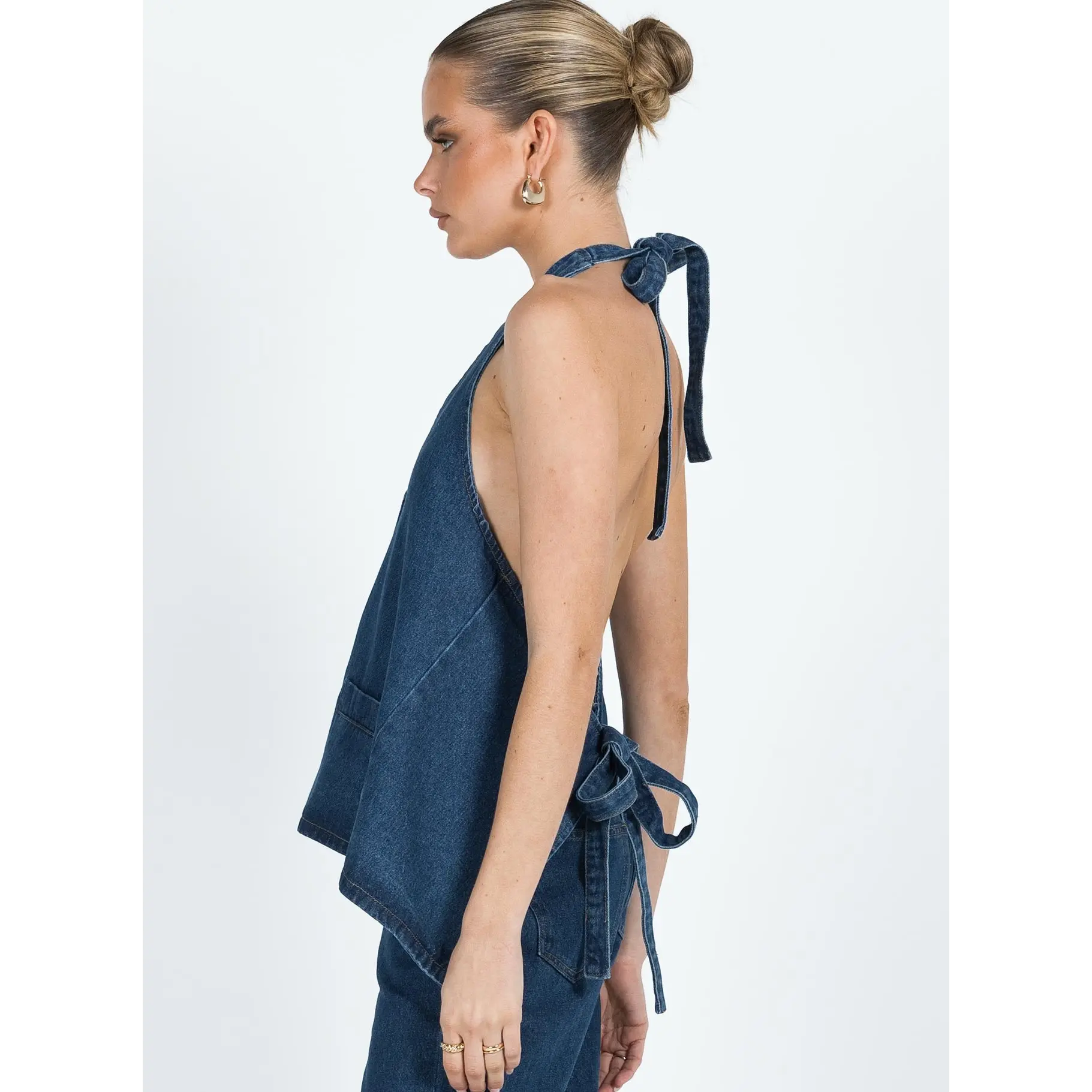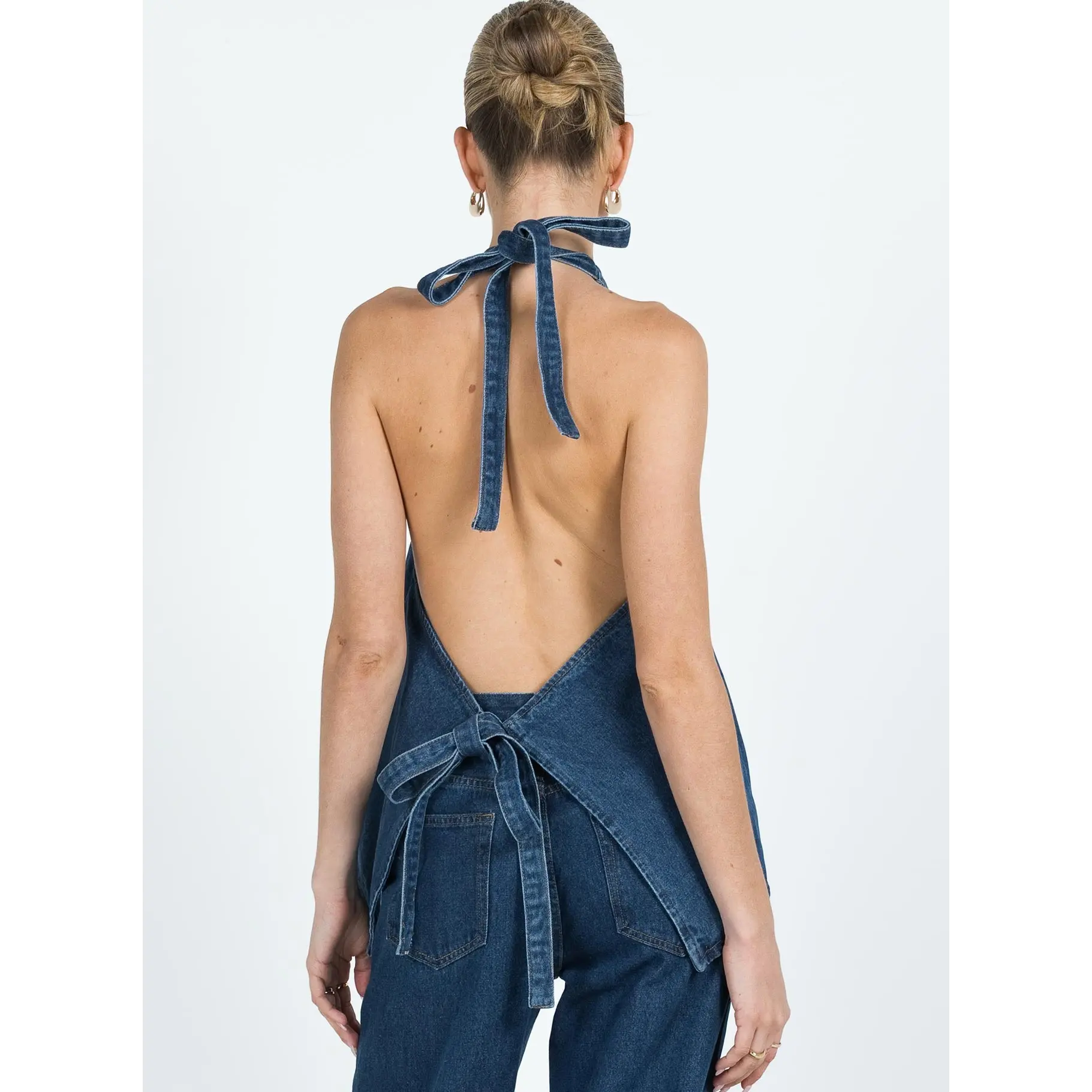 Back is very open but can adjust slightly with straps at the back and neck. Perfect deep blue denim colour