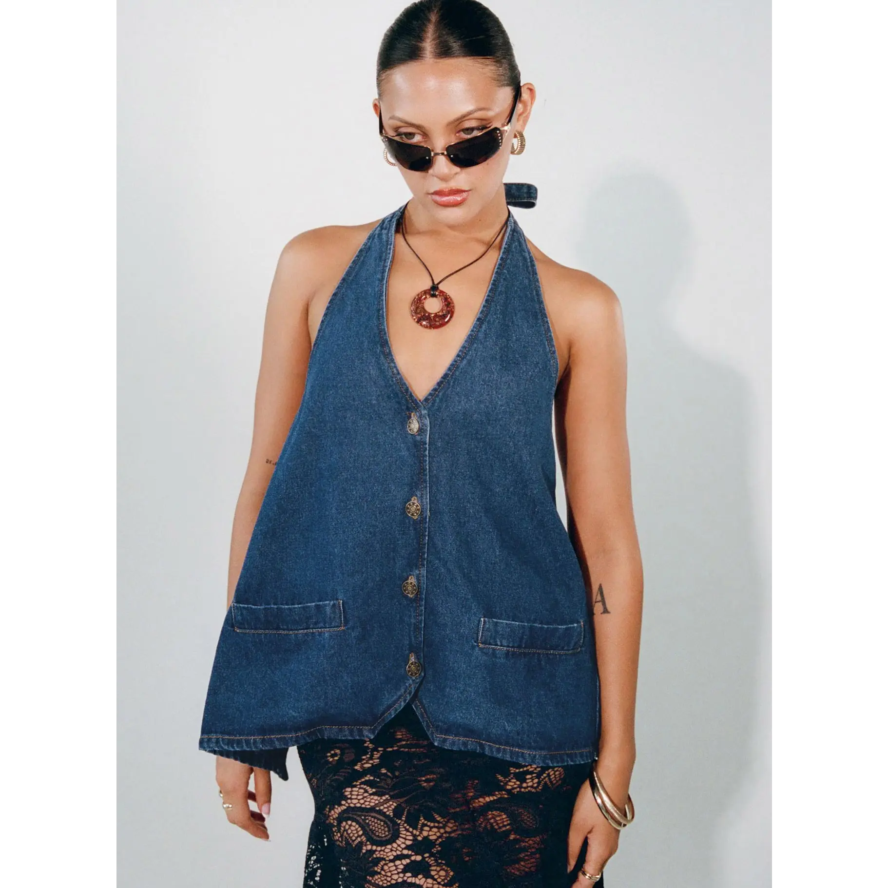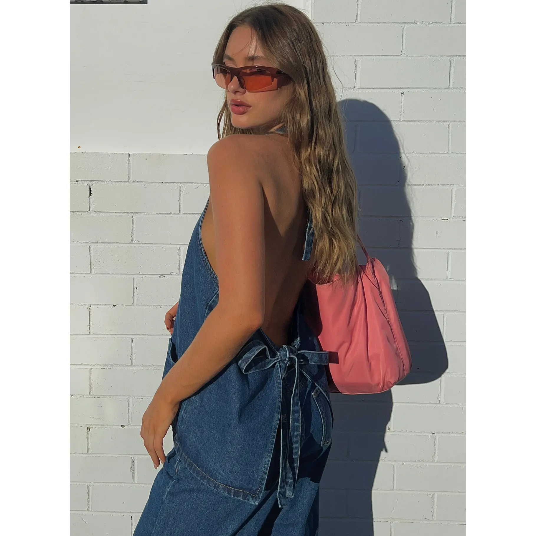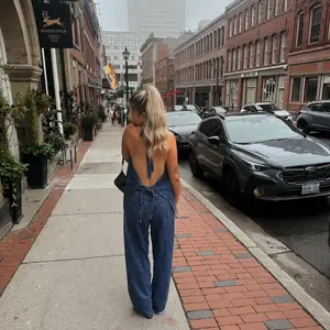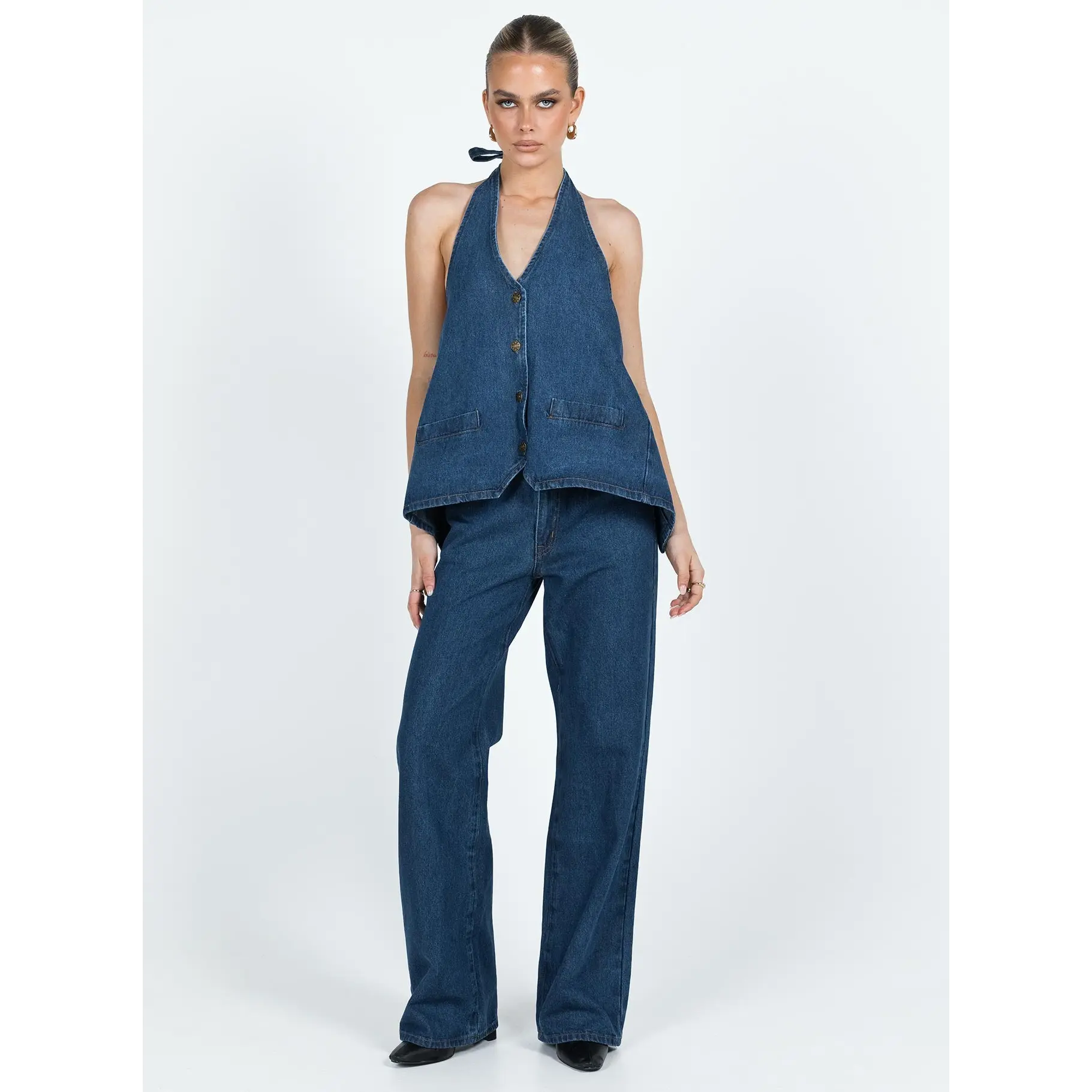 Back is very open but can adjust slightly with straps at the back and neck. Perfect deep blue denim colour