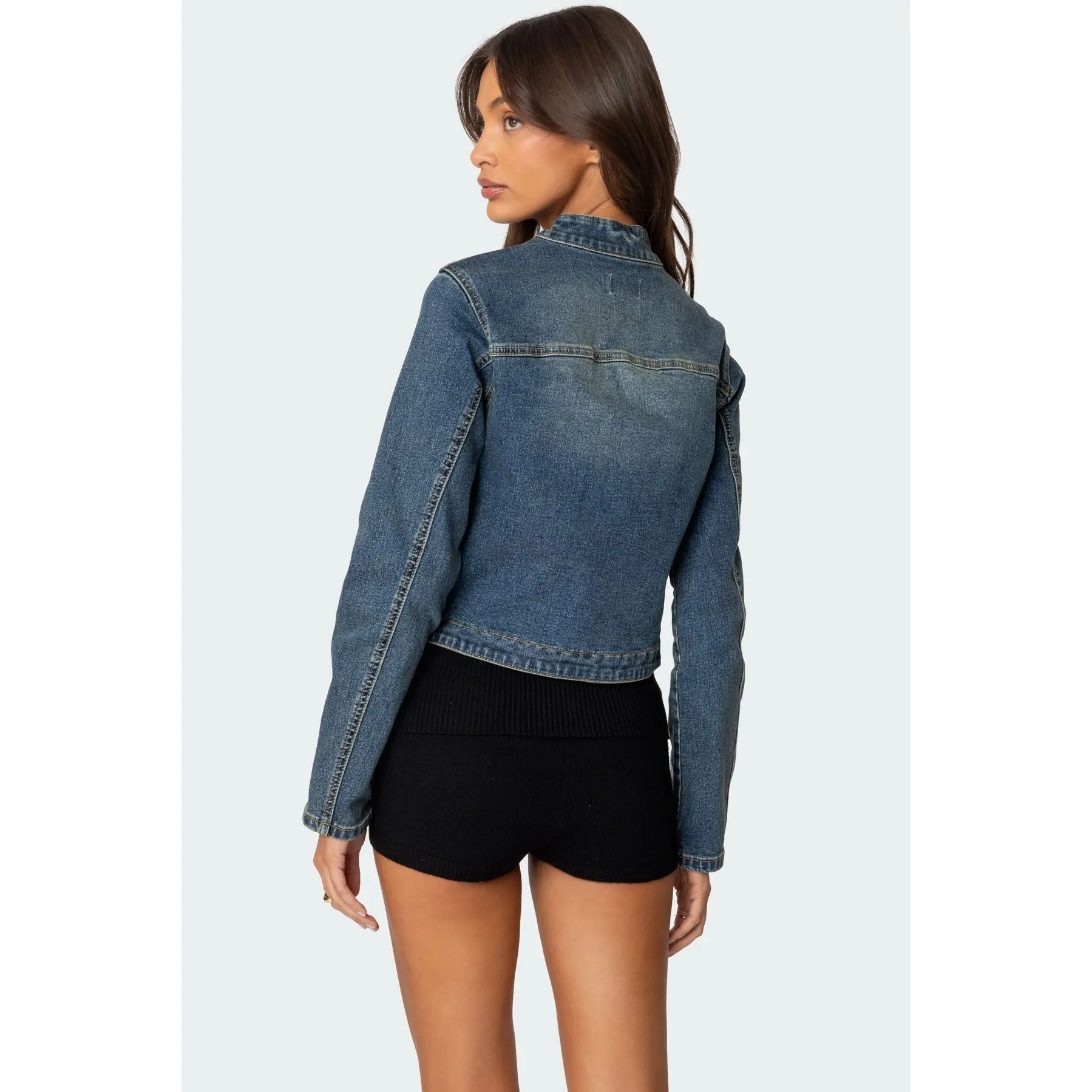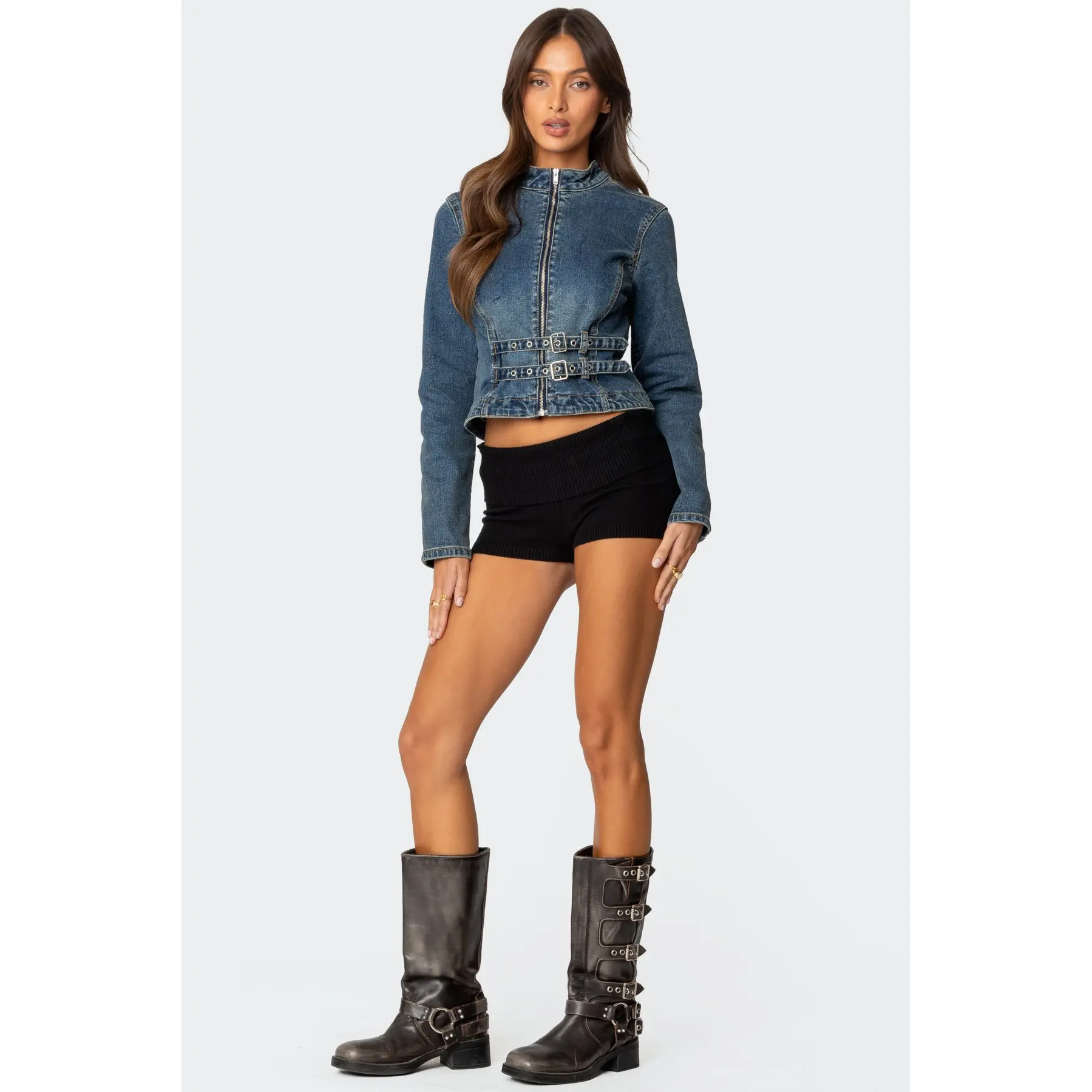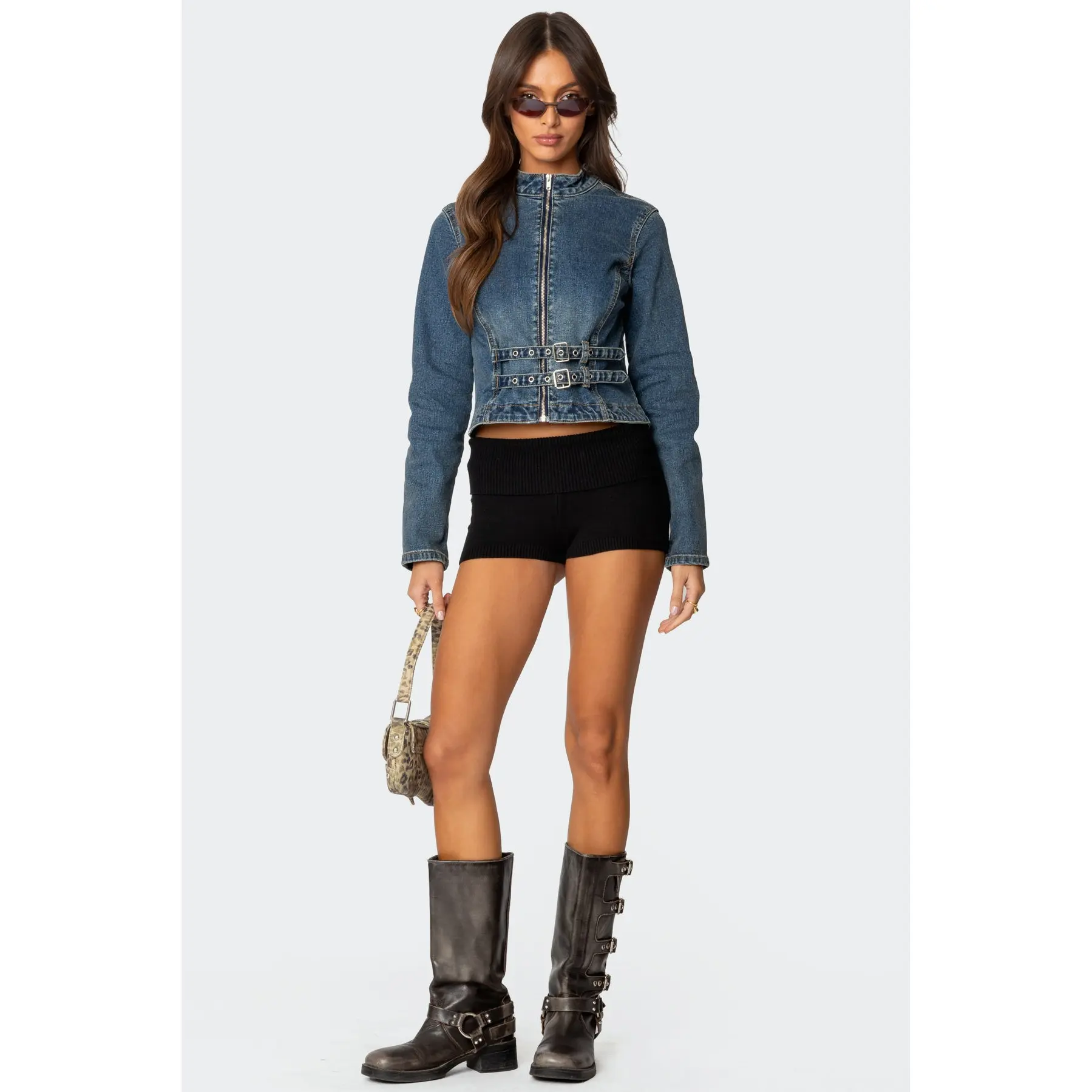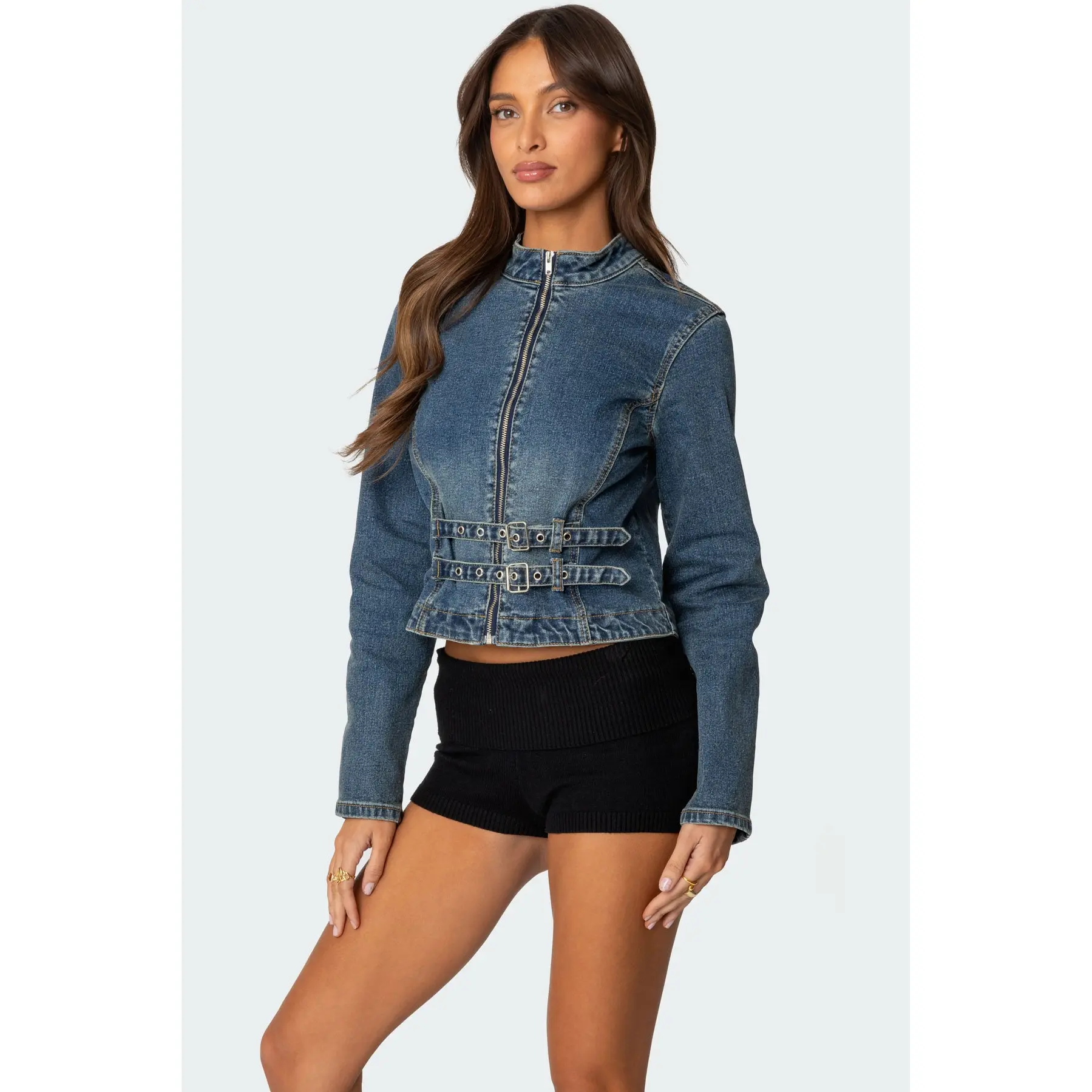double buckle denim jacket is fitted and so flattering with a little bit of stretch! Pair it with any outfit or even denim jeans for a denim on denim look! #edikteddenimjacket #tiktokshopblackfriday #fitteddenimjacket #tiktokshopcreatorpicks #tiktokshopcybermonday @Edikted