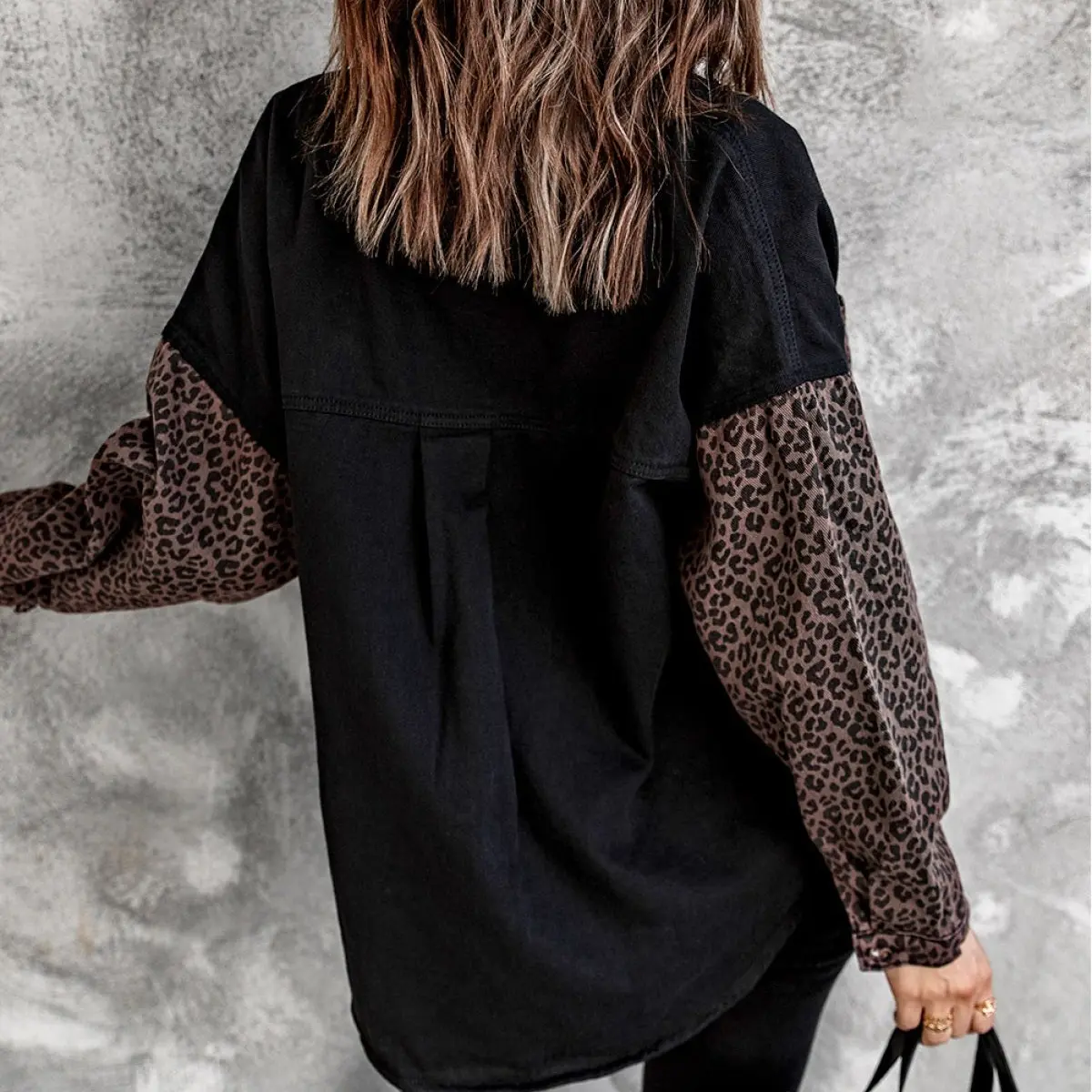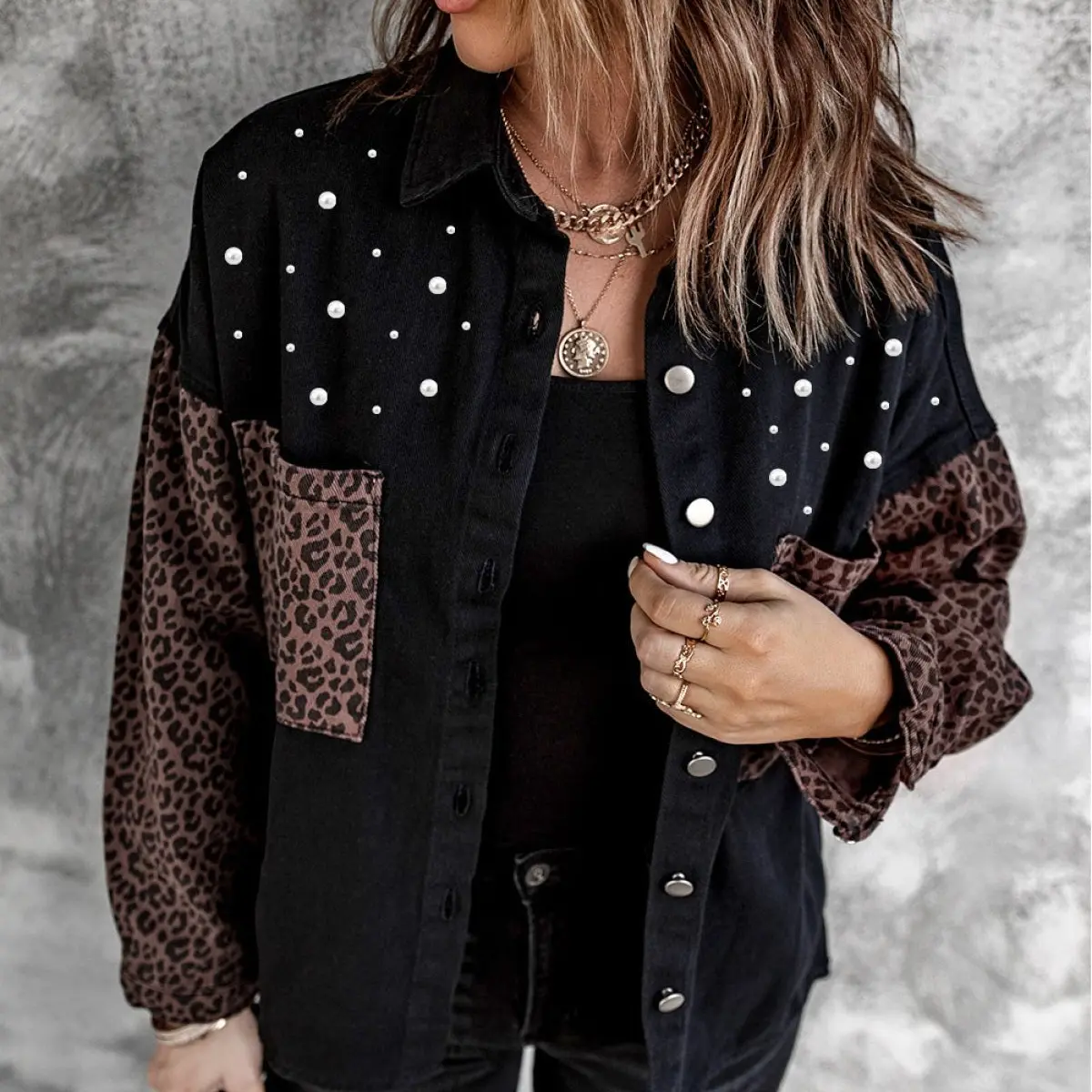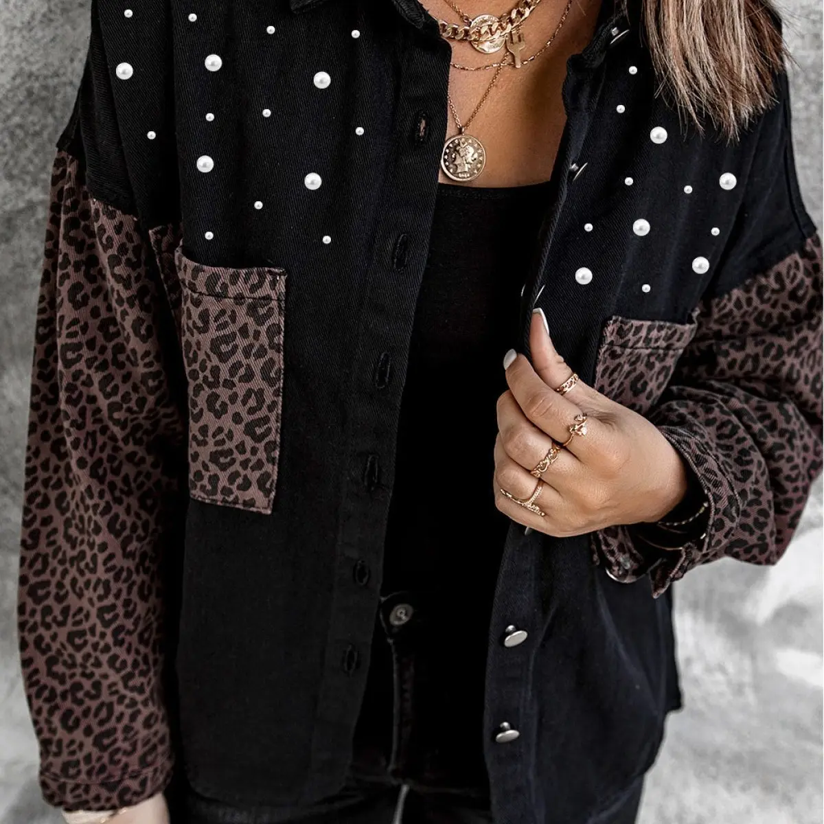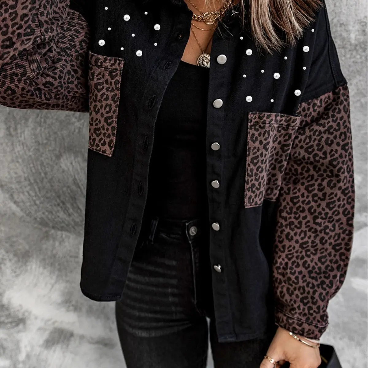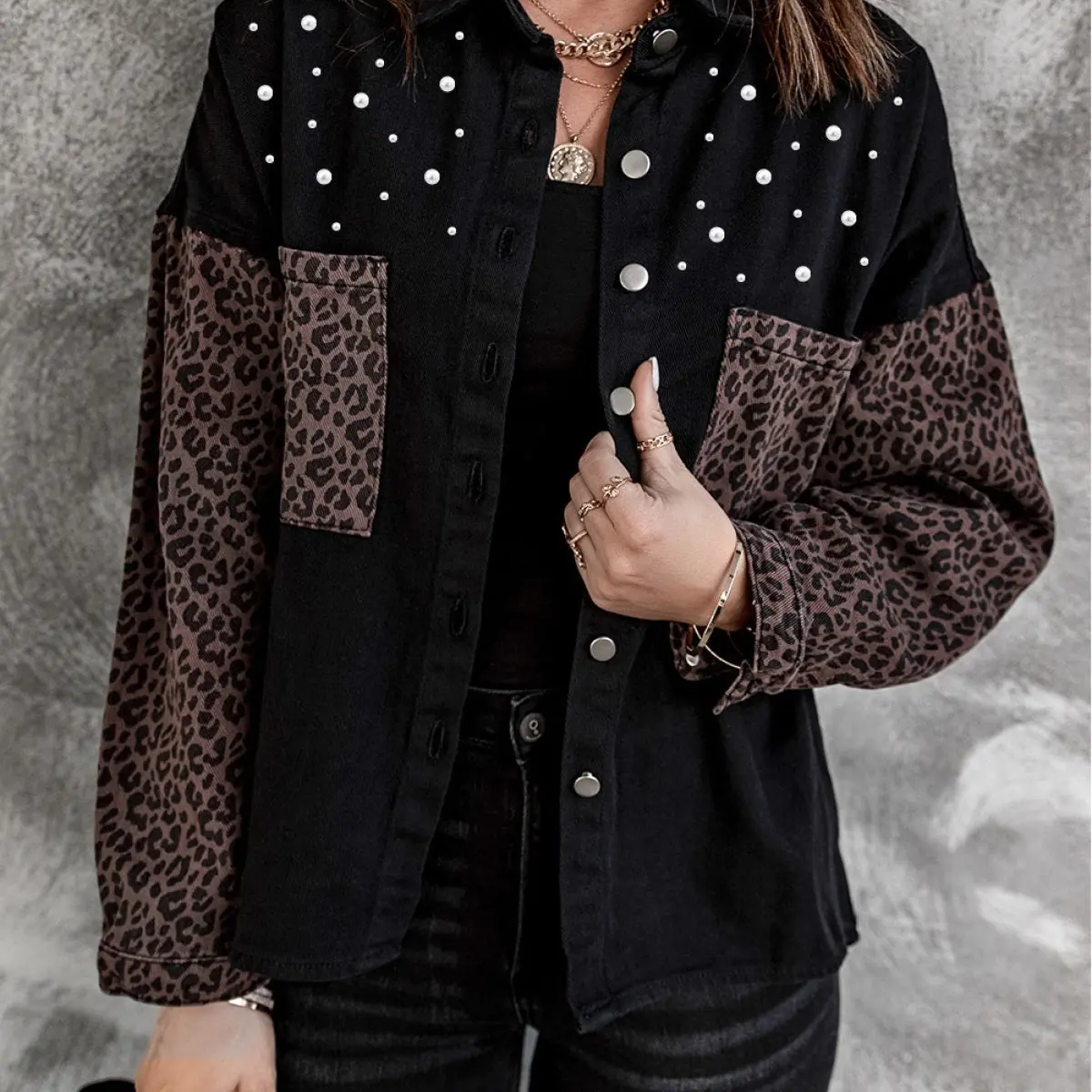EMMA BLACK LEOPARD PATCHWORK BEADED CHEST POCKETS DENIM JACKET Cotton Casual Slim-fitting Plain Floral Striped Black White Summer