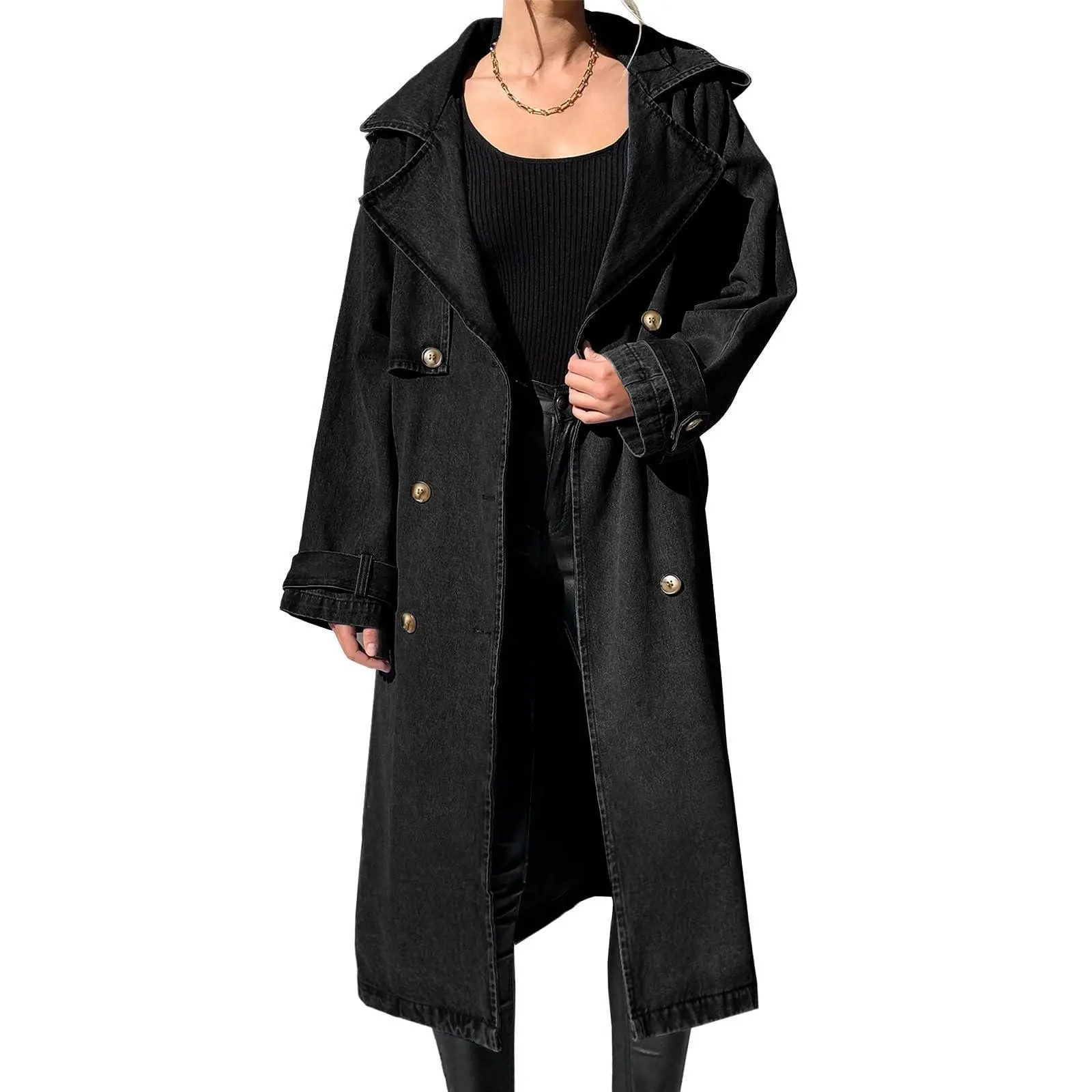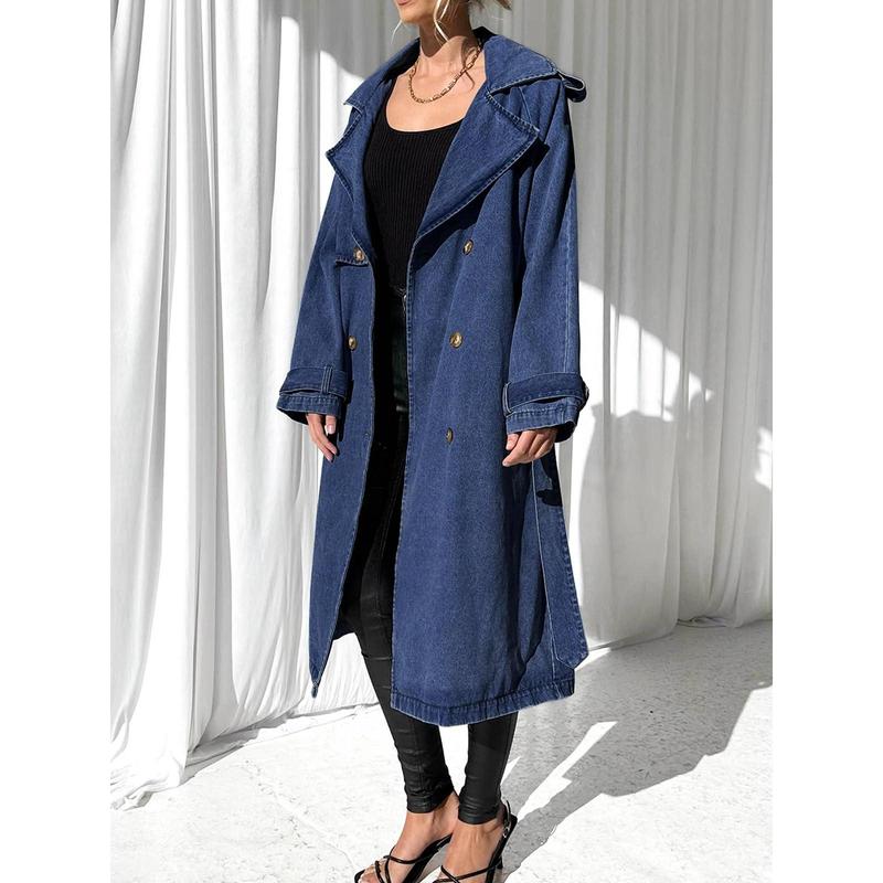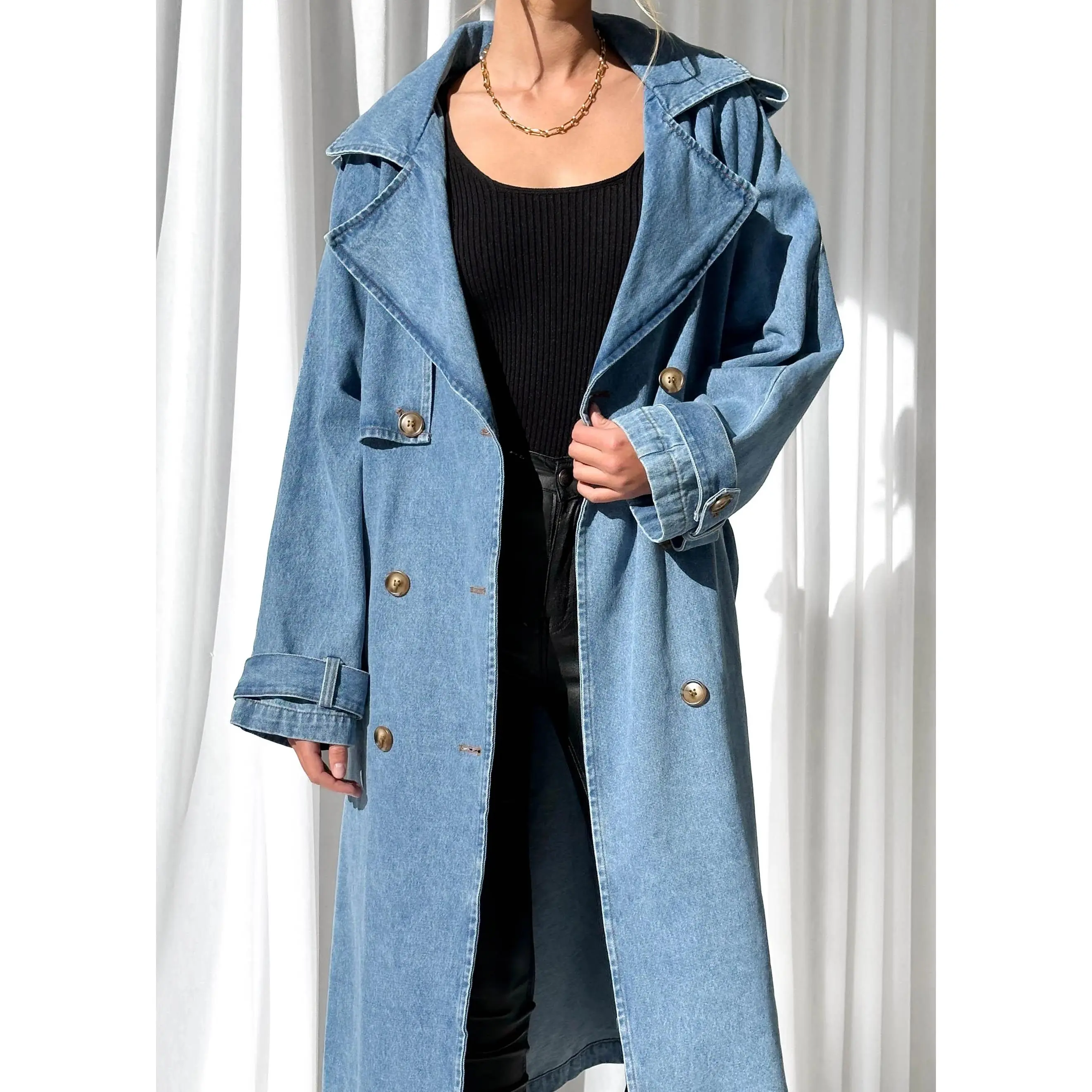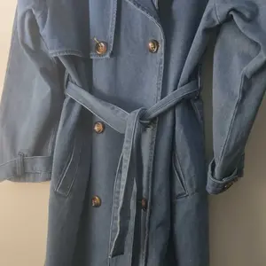 This denim trench is superb. The seller provided me with the perfect size. For size reference I am 5’3” 195lbs and the medium fit me perfect. The denim is soft, not stiff at all, perfect to layer with sweaters. Loves it so much I ordered the light blue one.