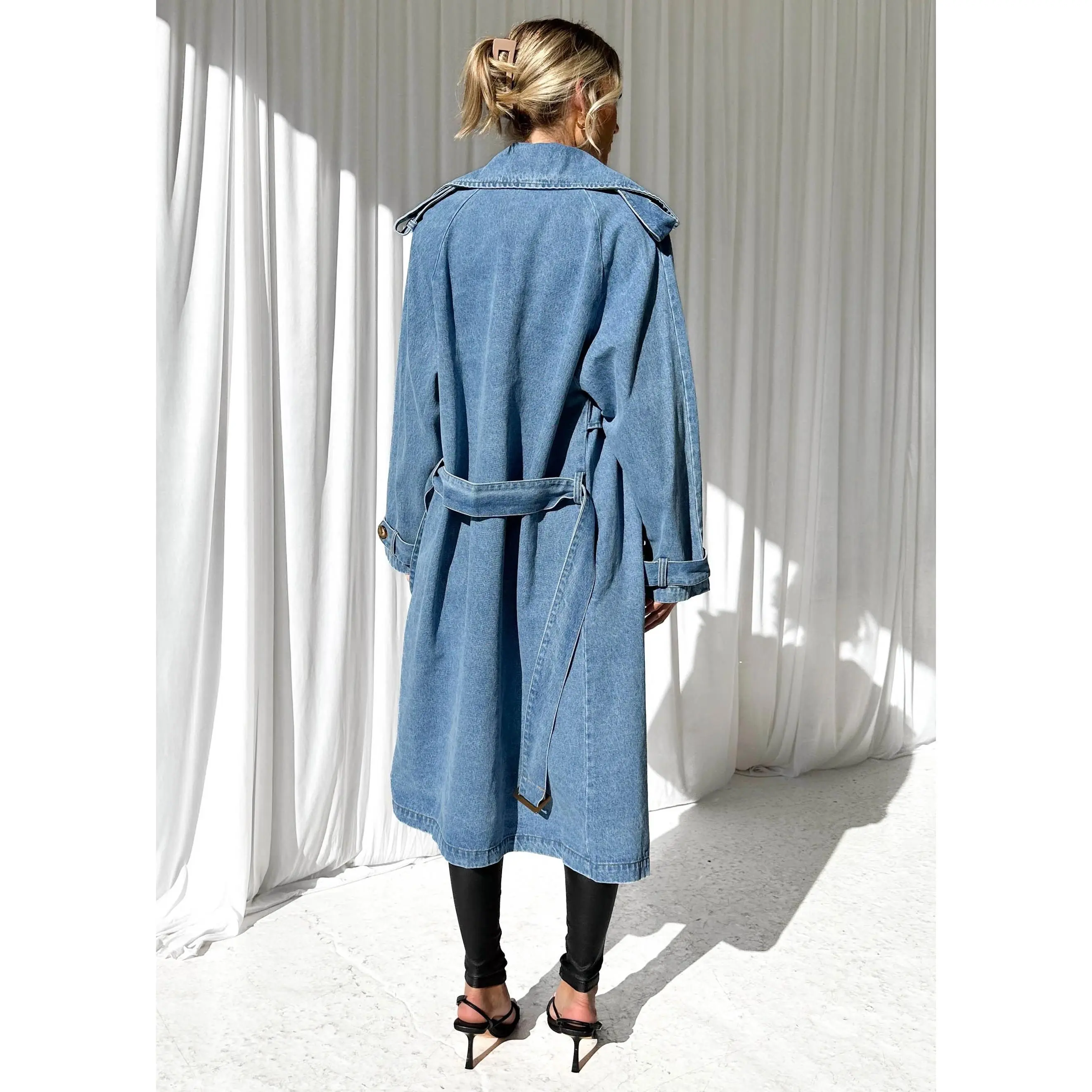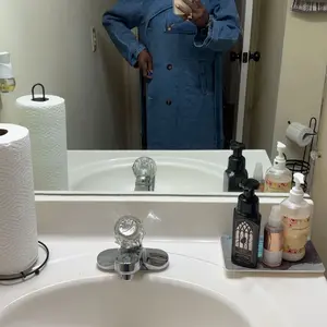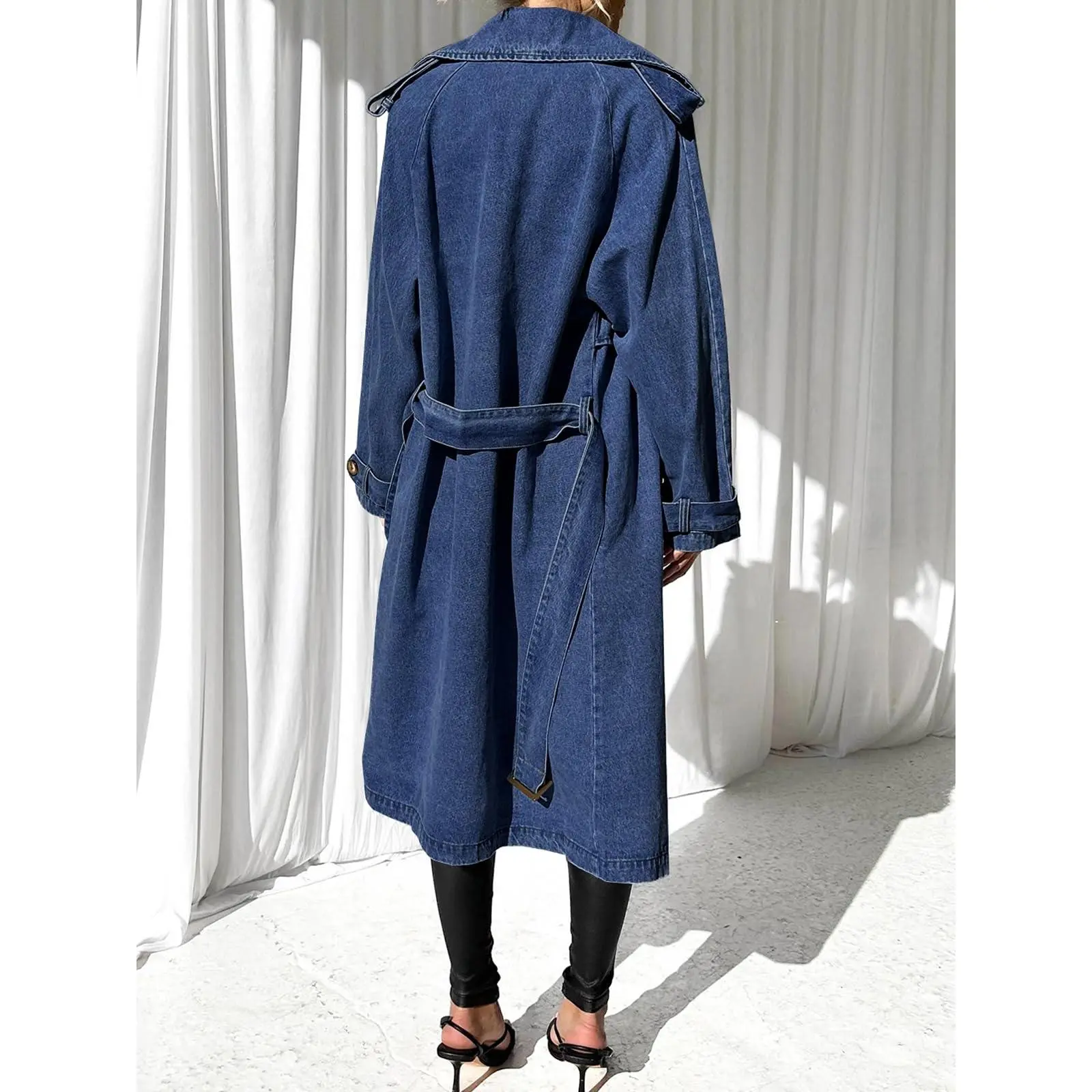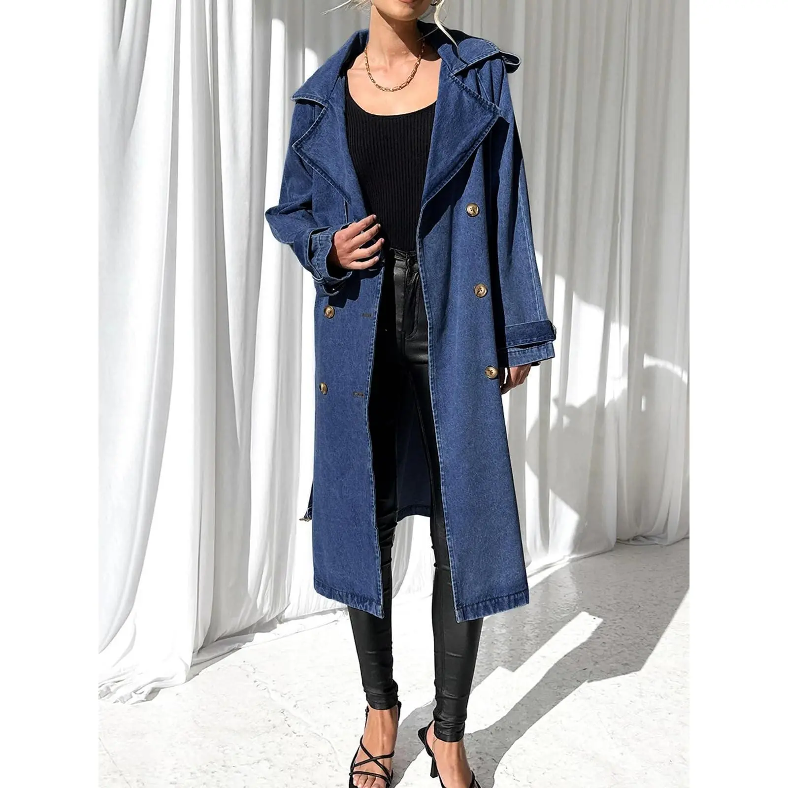 This denim trench is superb. The seller provided me with the perfect size. For size reference I am 5’3” 195lbs and the medium fit me perfect. The denim is soft, not stiff at all, perfect to layer with sweaters. Loves it so much I ordered the light blue one.