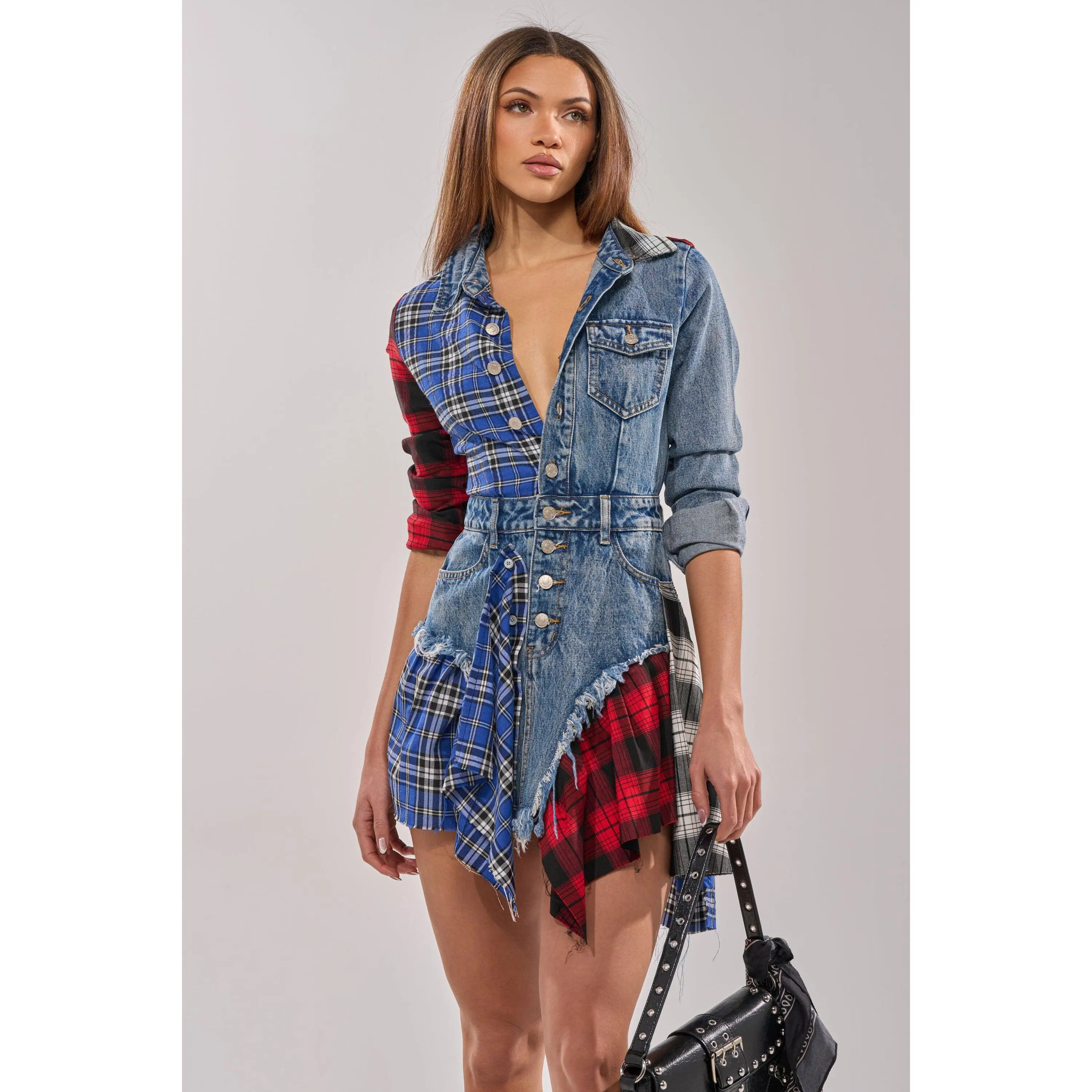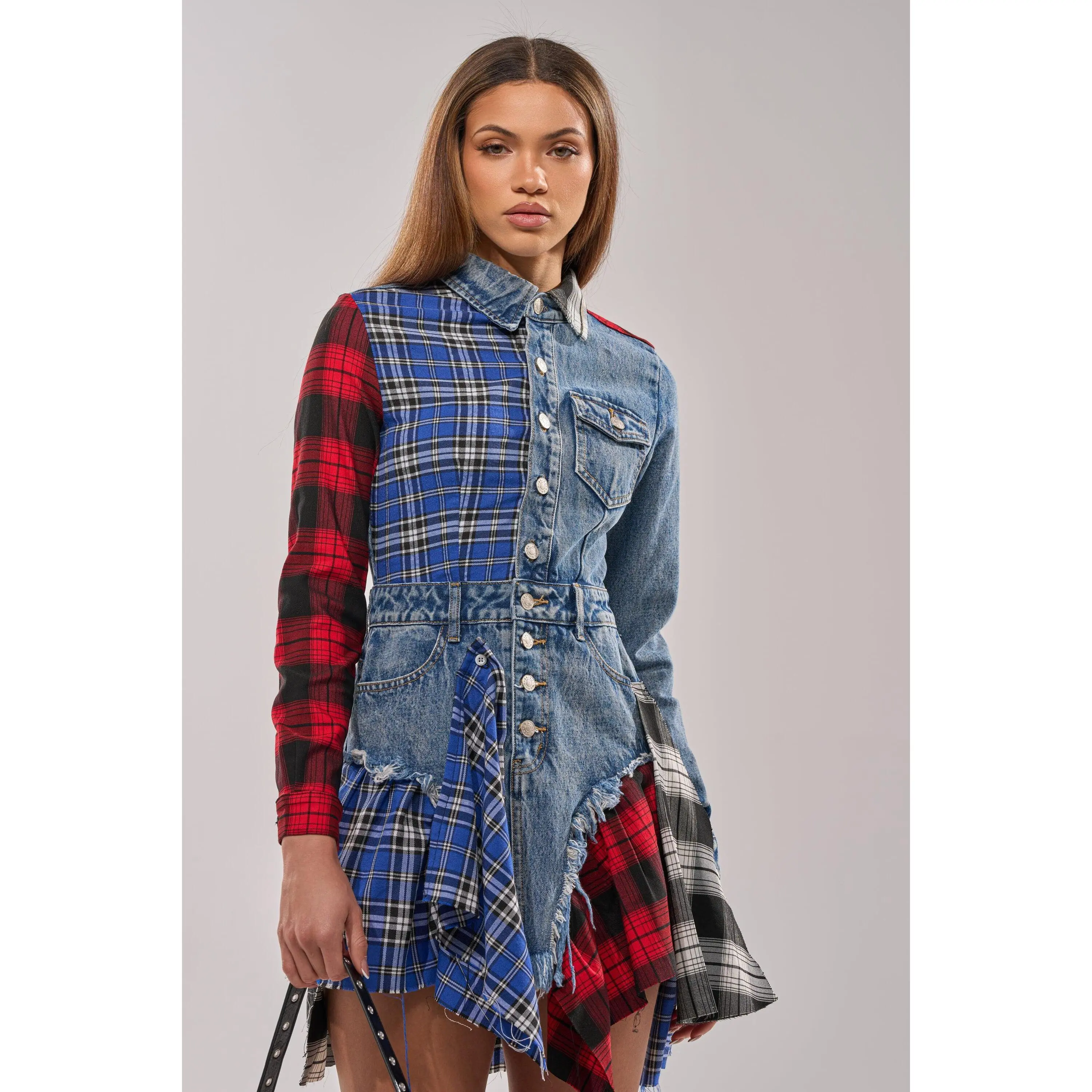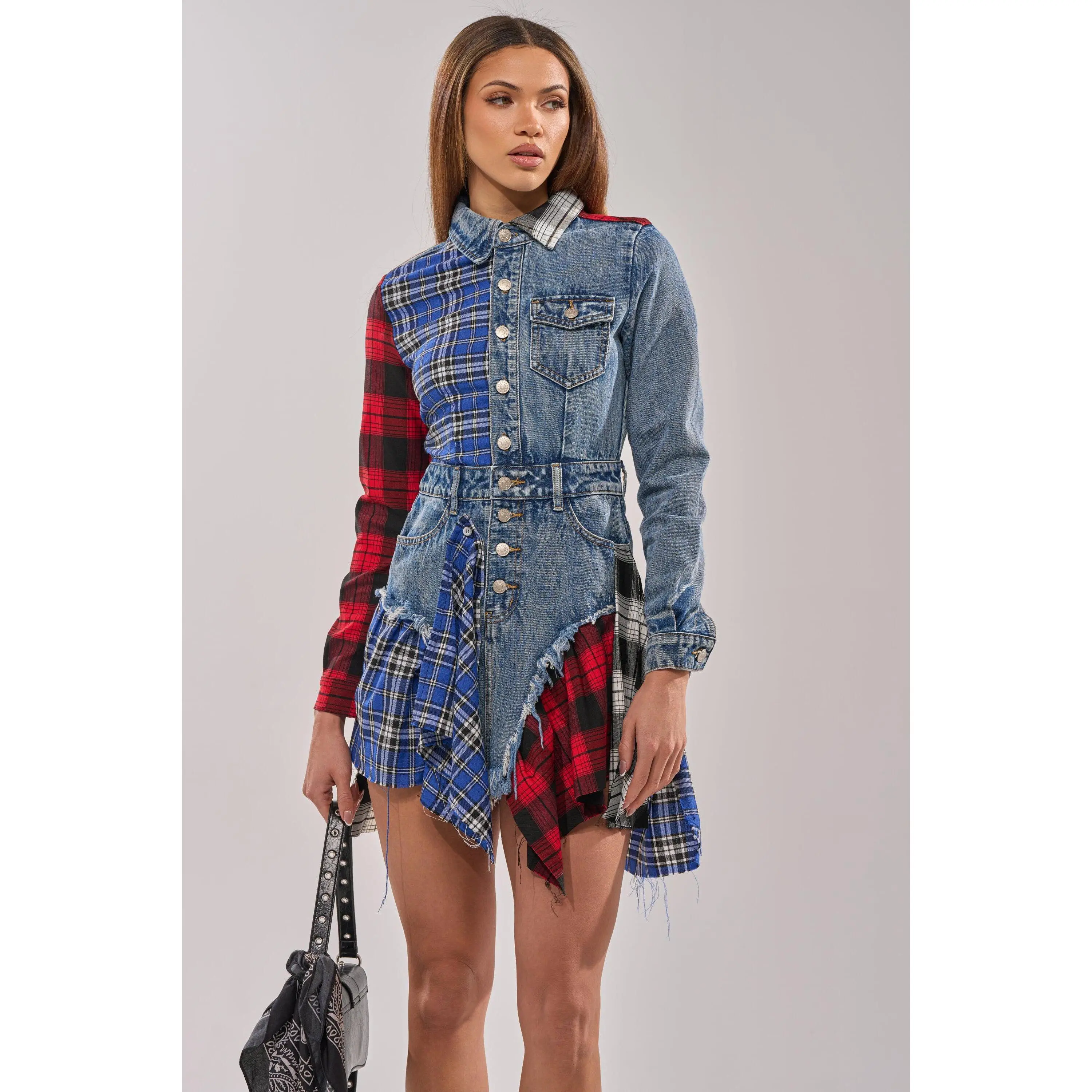 Patchwork denim and plaid long-sleeved shirt dress designed for bold streetwear styling, contemporary casual fashion, and statement festival looks. This mini is made from a cotton base, consisting of a patchwork design combining both dark-wash denim and plaid flannel fabrications. This punk-inspired piece features differing long sleeves with buttoned cuffs, a pointed fold-over collar, a five pocket design, an asymmetrical hemline, and a button-down front closure. Style with fishnet tights and chunky combat boots for an enviably edgy ensemble. Note: Pattern may vary to the description.- Main: 100% Cotton, Trim: 75% Rayon 22% Polyester 3% Spandex- Little to No Stretch- Imported(all measurements are approximate from size small)- 29” Shoulder to Shortest Hem, 34” Shoulder to Longest Hem- 24” Sleeves- 14” Shoulder to Shoulder- Model is 5'9" and wearing a size smallProduct ID: 368110(all measurements are approximate from size 1X)- 32” Shoulder to Shortest Hem, 36.5” Shoulder to Longest Hem- 25” Sleeves- 16.5” Shoulder to ShoulderProduct ID: 393453