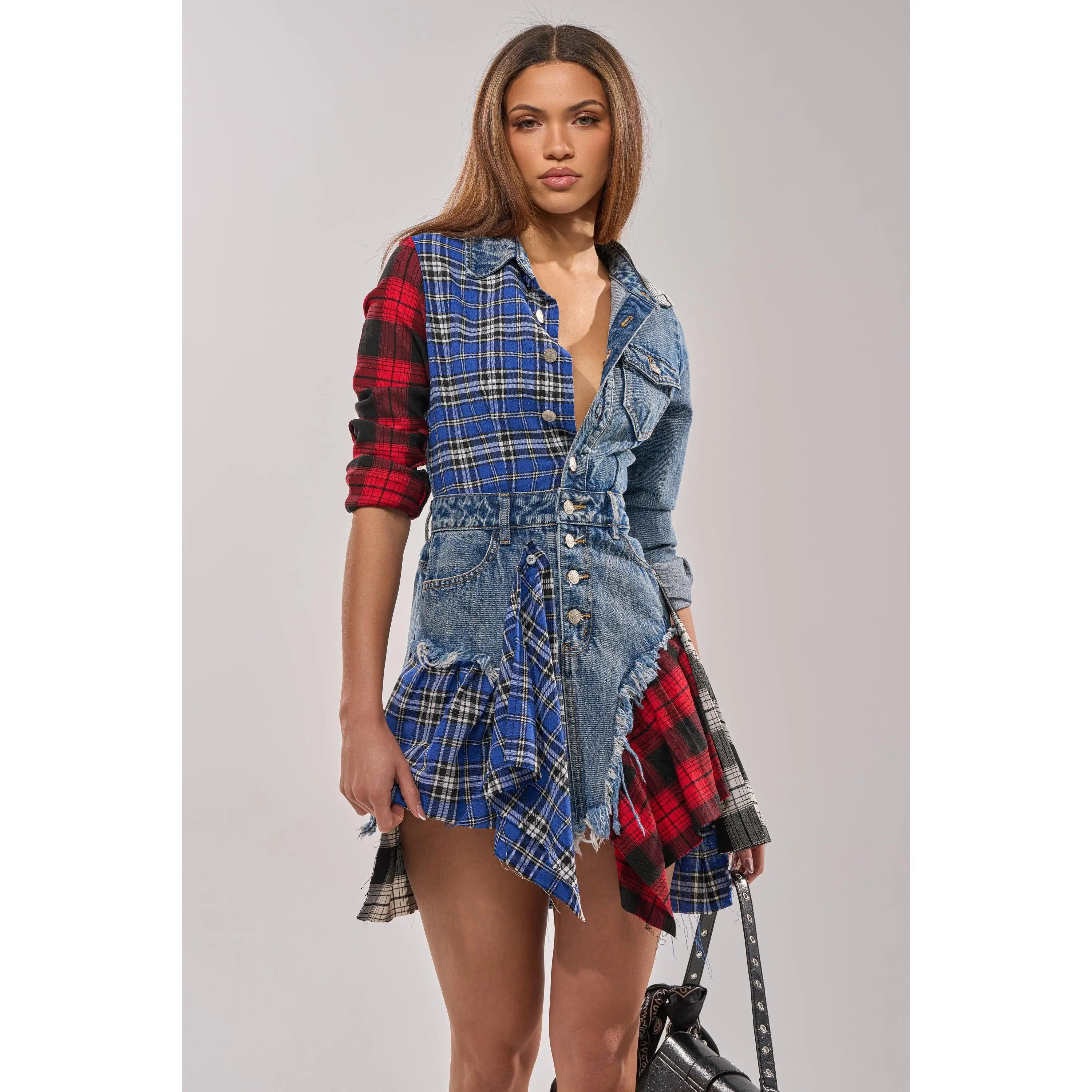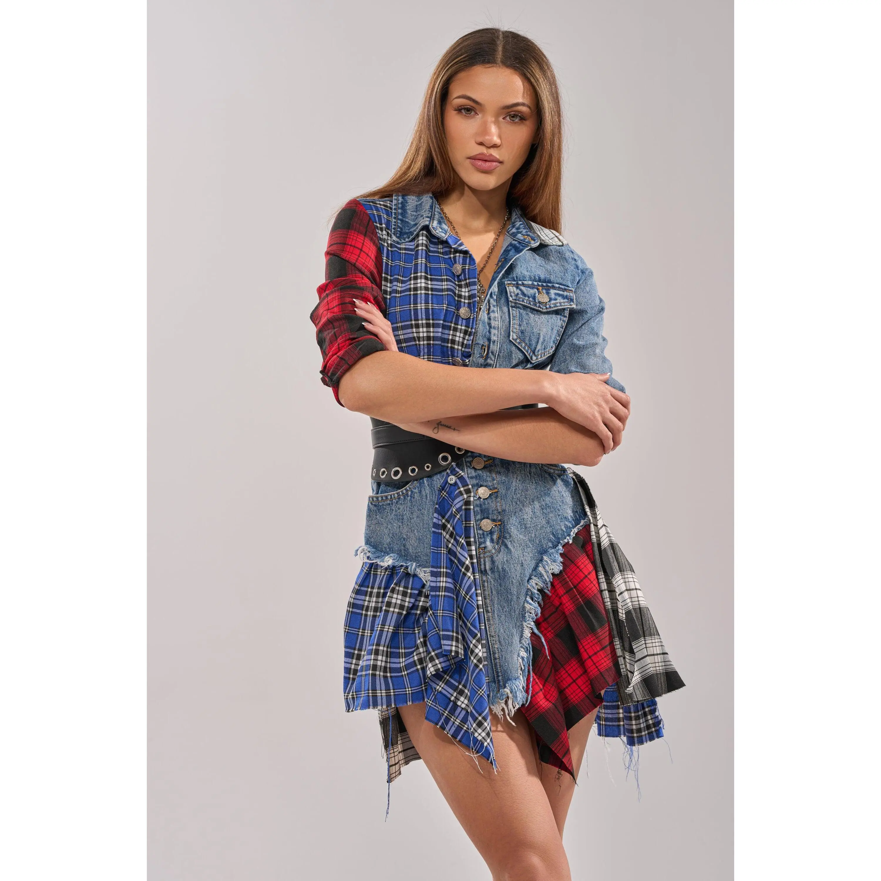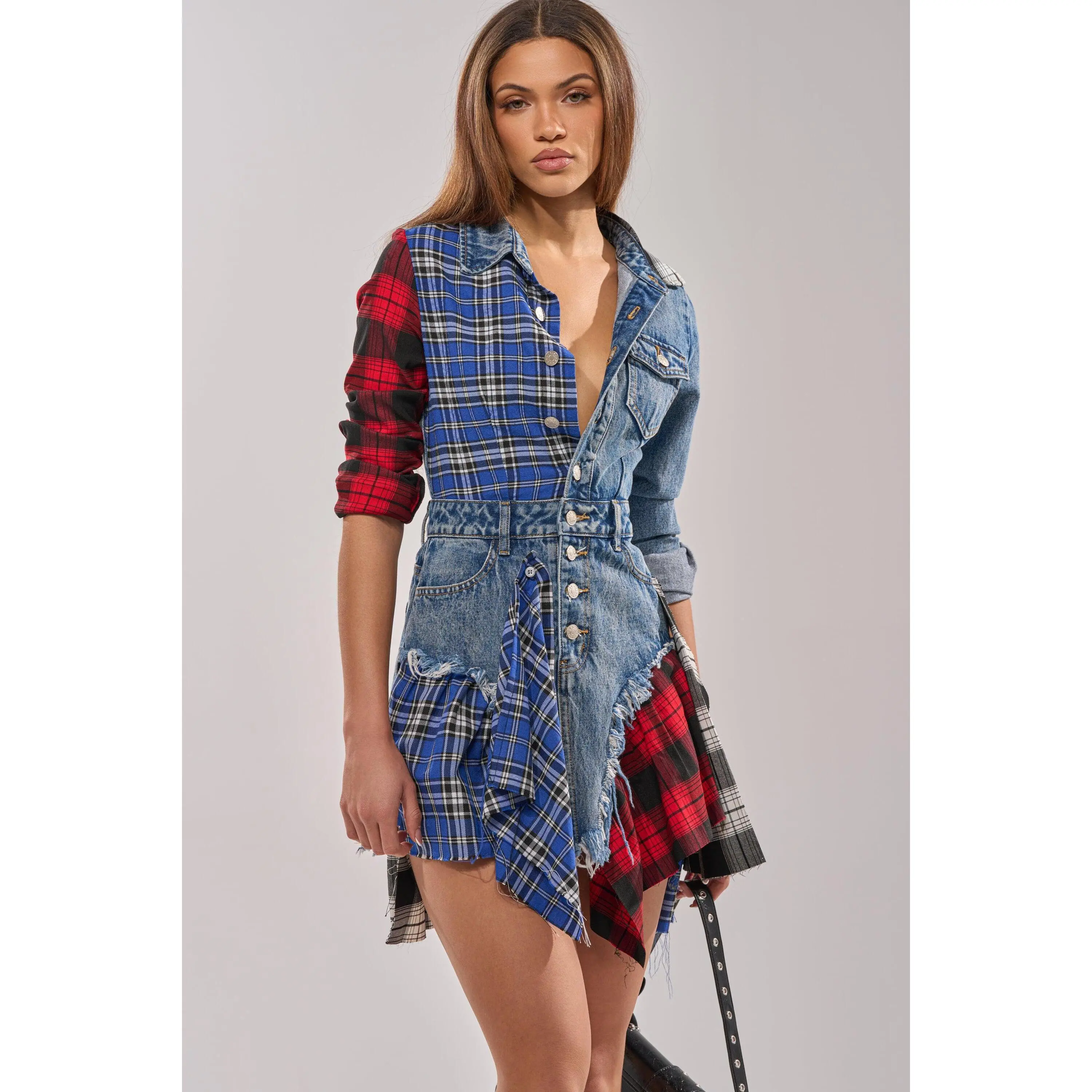 Patchwork denim and plaid long-sleeved shirt dress designed for bold streetwear styling, contemporary casual fashion, and statement festival looks. This mini is made from a cotton base, consisting of a patchwork design combining both dark-wash denim and plaid flannel fabrications. This punk-inspired piece features differing long sleeves with buttoned cuffs, a pointed fold-over collar, a five pocket design, an asymmetrical hemline, and a button-down front closure. Style with fishnet tights and chunky combat boots for an enviably edgy ensemble. Note: Pattern may vary to the description.- Main: 100% Cotton, Trim: 75% Rayon 22% Polyester 3% Spandex- Little to No Stretch- Imported(all measurements are approximate from size small)- 29” Shoulder to Shortest Hem, 34” Shoulder to Longest Hem- 24” Sleeves- 14” Shoulder to Shoulder- Model is 5'9" and wearing a size smallProduct ID: 368110(all measurements are approximate from size 1X)- 32” Shoulder to Shortest Hem, 36.5” Shoulder to Longest Hem- 25” Sleeves- 16.5” Shoulder to ShoulderProduct ID: 393453