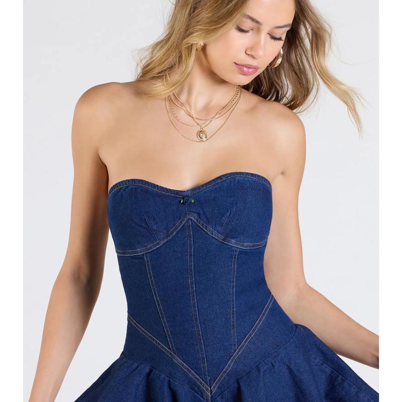 Uniquely Darling Strapless Pleat & Skater Denim Mini Dress #dress #minidress #casualoutfits #spotlightfinds #fyp
