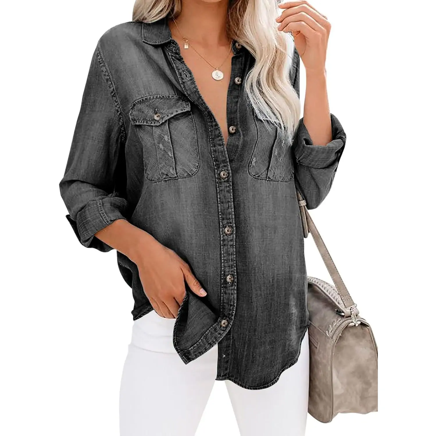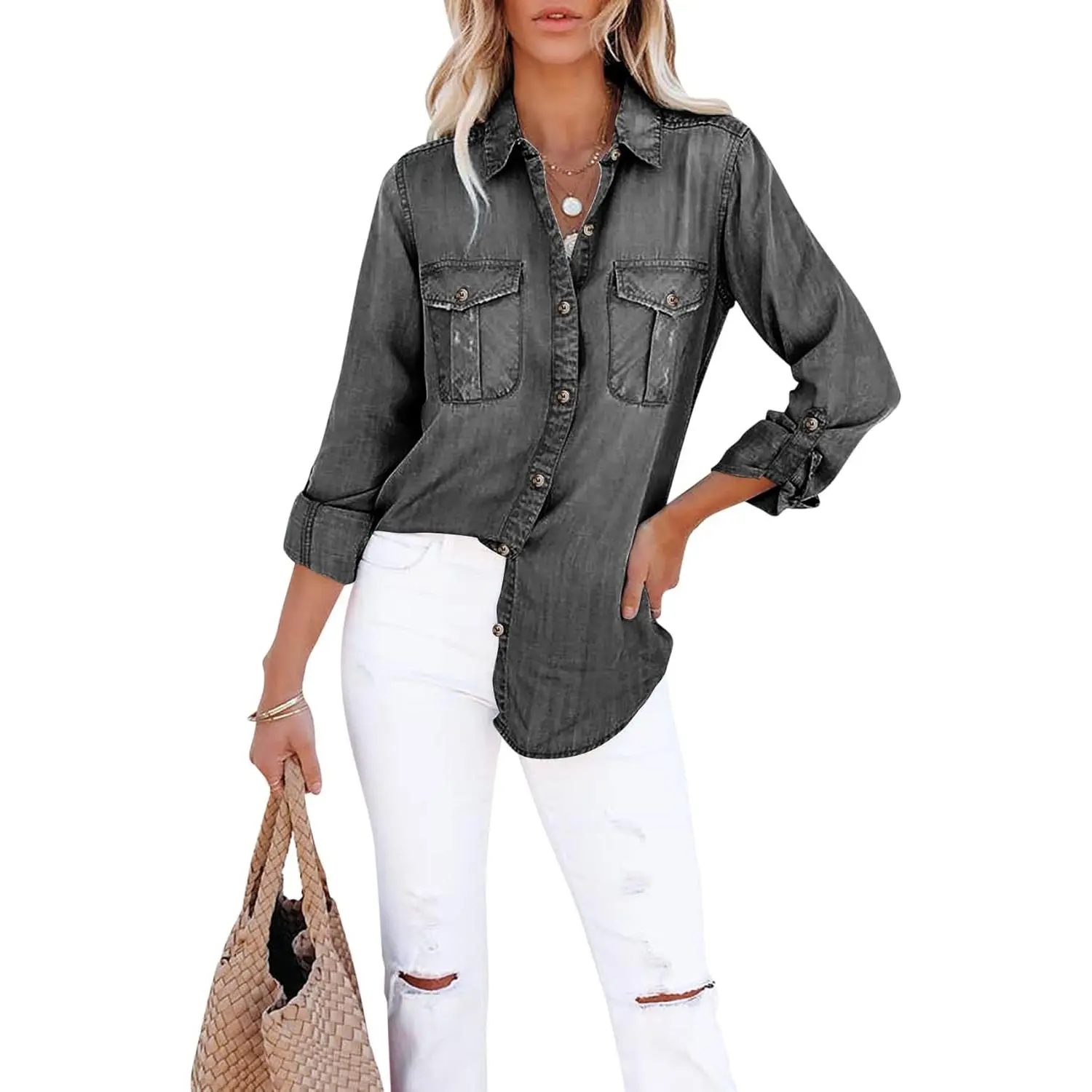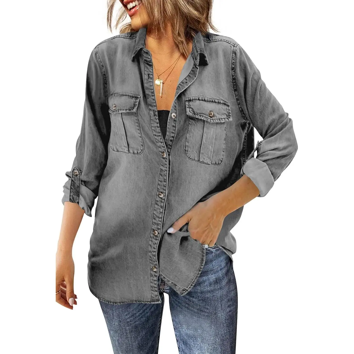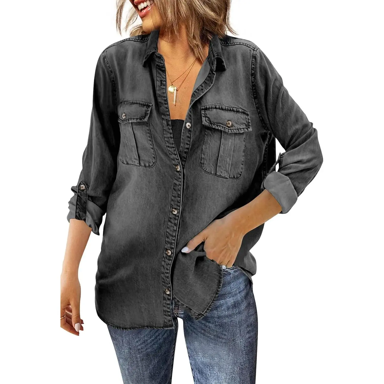 ·Casual denim shirts for women, button down, long sleeve can roll up, turn down collar, v neck, loose fit tunic tops with chest pockets, classic oversized design, lightweight, classic work office shirt blouse.