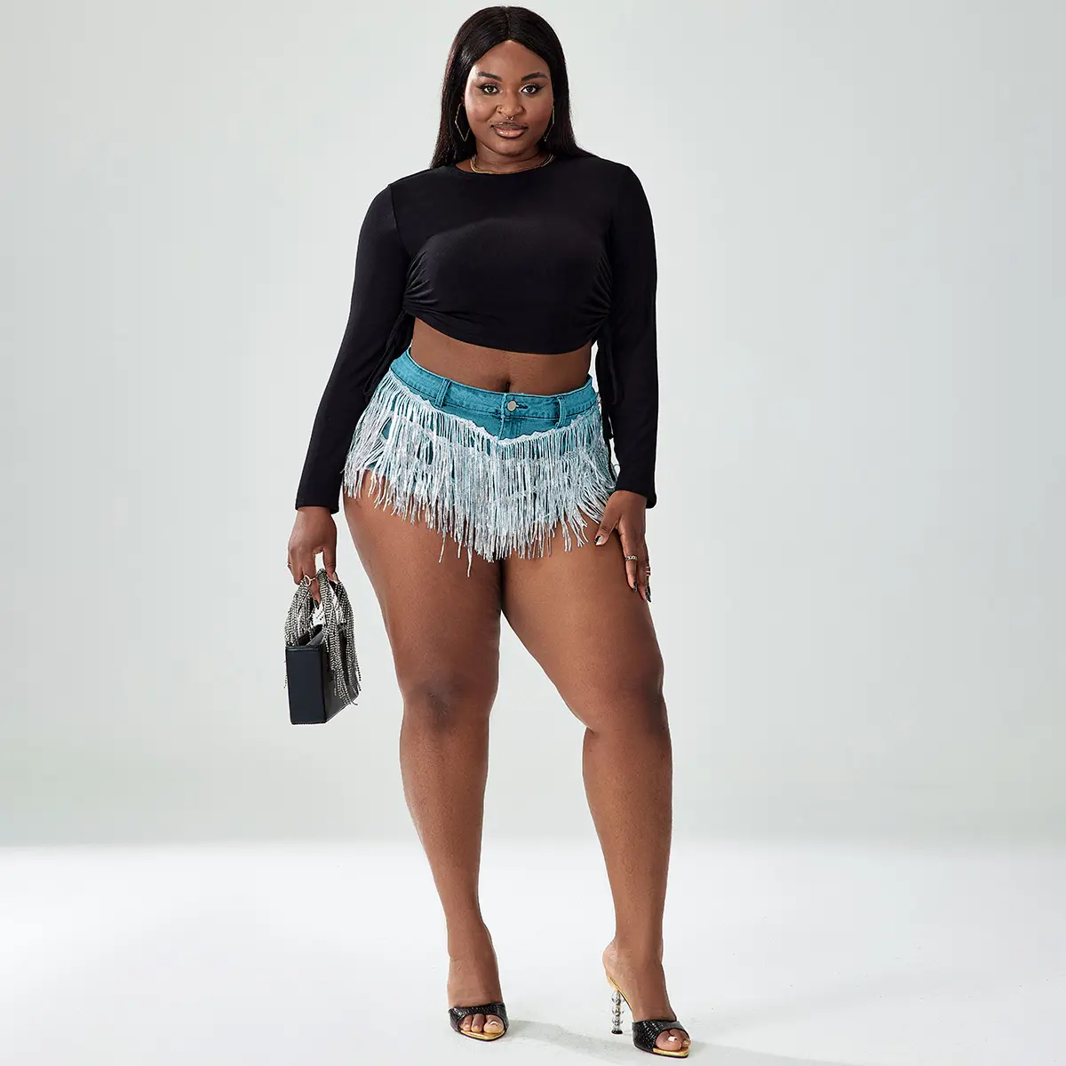 5. Xpluswear Plus Size Silver Party Sequin Fringe Button Denim Shorts