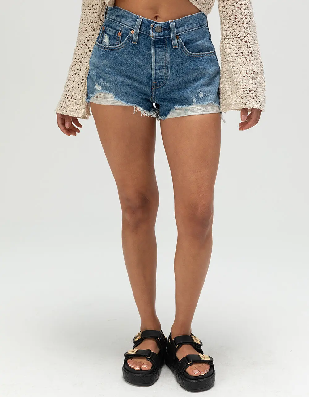 Levi's Premium 501 Original Fit High Rise Denim Shorts. Button fly. 5-pocket denim styling. Rip details throughout with fraying at pockets. Raw edge hems. Belt loop waist. Approximate inseam: 2in. Approximate outseam: 11in. 100% Cotton. Machine wash. Imported. Model is wearing a size 26. Model measurements:Height: 5’7” Bust: 32C. Waist: 24”Hips: 35”