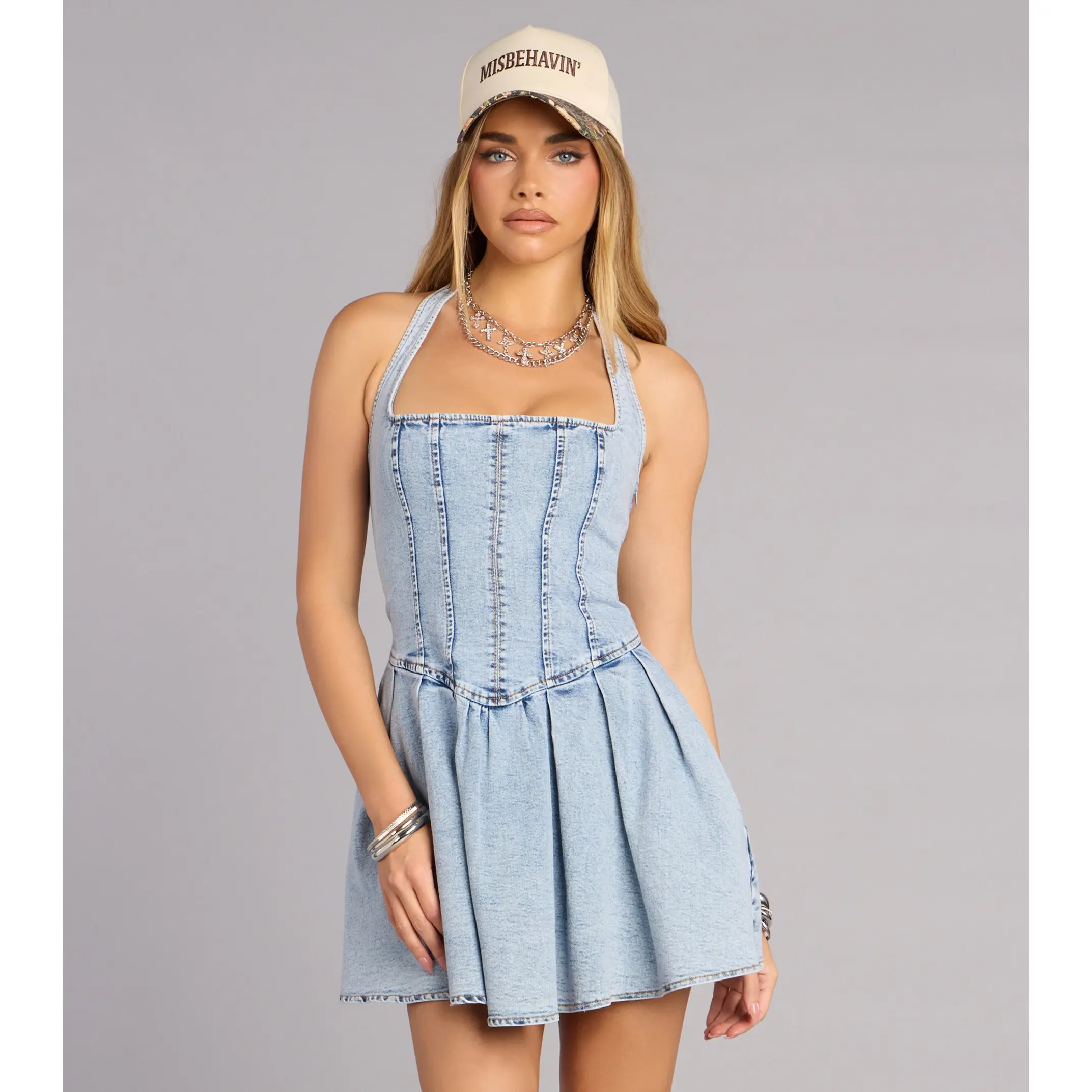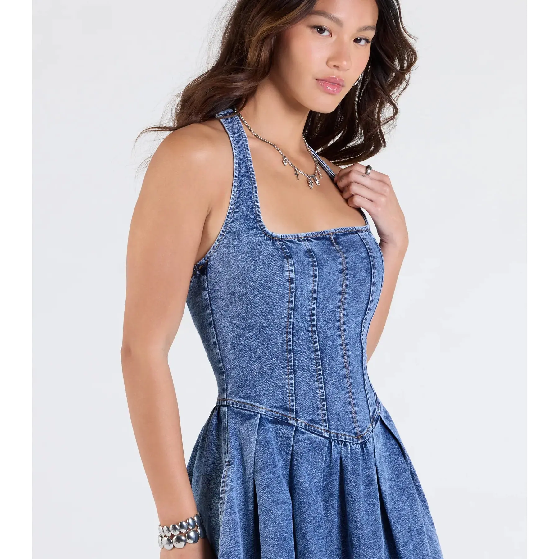 5. Darling Charm Halter Pleated Denim Skater Dress