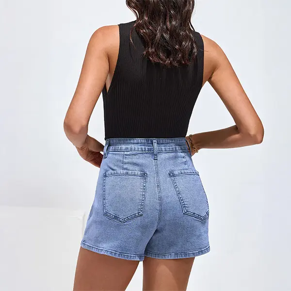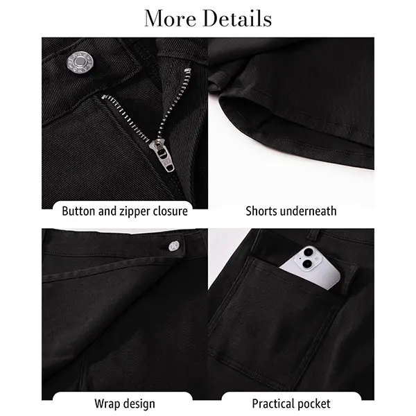 Luvamia Denim Skorts blend skirt elegance with shorts practicality. Made from stretch fabric, they offer comfort and versatility for daily wear. The faux wrap design and high waist enhance leg length, creating a flattering silhouette. Perfect for various occasions like concerts, beach outings, or school.