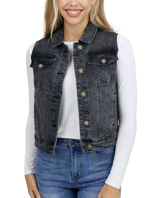 Fitted classic sleeveless denim vest. Functional exterior pockets and hidden interior phone pocket. Black wash denim fabric has slight stretch. Fit is true to size. If between sizes, size down for intentional fitted look or size up for a looser fit.