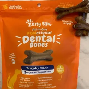 As a dog parent, it's only natural that you'd want to support Fido's chompers to give them a boost of Zest. But why stop at just a basic breath freshener that can't do a deep teeth clean for your dog? Go big with these All-in-One FUNctional Dental Bones! Oral health and fresh breath are just the beginning of what these bones can do!