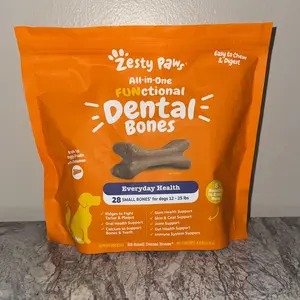 This pouch of Small size Zesty Dental Bones is ideal for dogs 15-25 lbs.