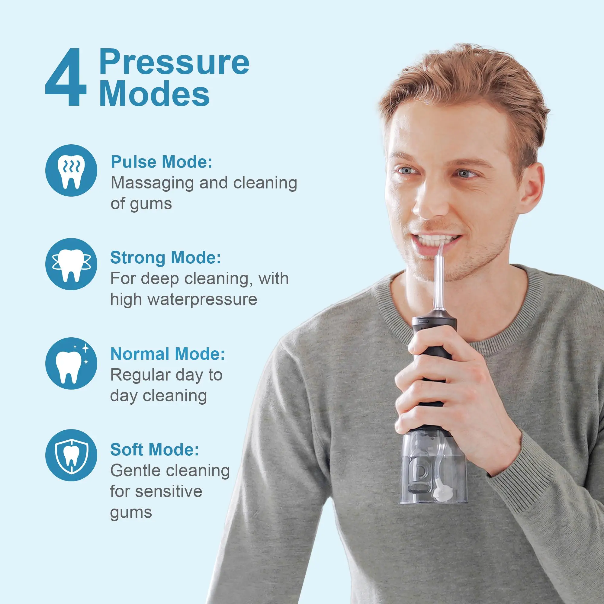 4 professional modes and nozzles: The water flosser has four cleaning modes: gentle, normal, pulse and strong. You can choose the gentle rinse mode to avoid excessive water pressure. Choose the mode that suits you according to your needs