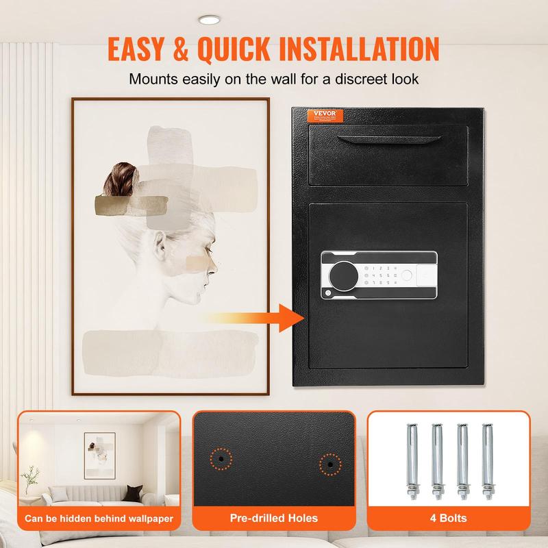 • Convenient & Easy Installation: Installing our drop safe is not only highly secure but also straightforward. Pre-drilled holes and bolts make it easy to mount the safe on walls, floors, or shelves. The two pre-drilled installation holes on the safe align with the door, simplifying the installation process. Completed in just a few minutes!