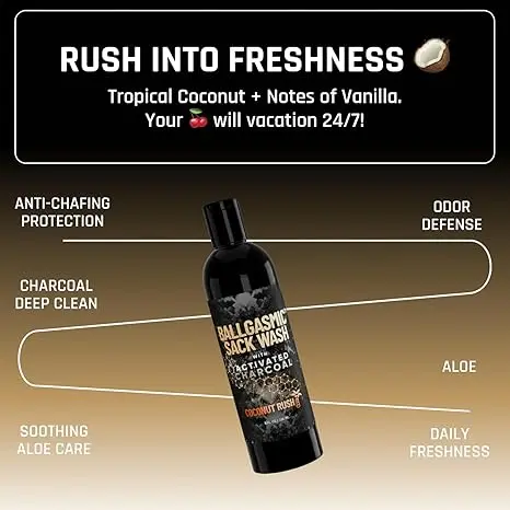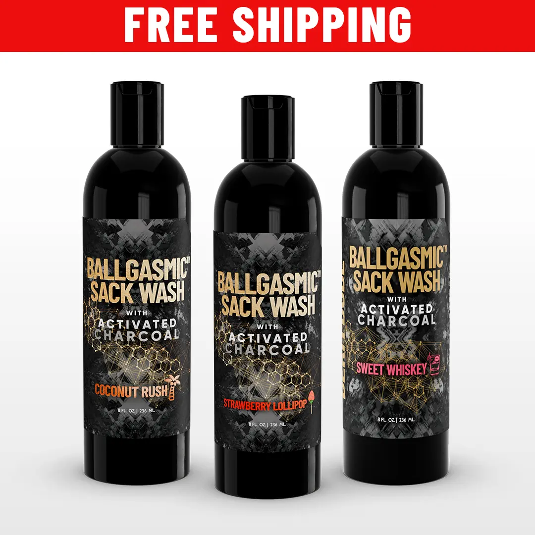 Enjoy the ultimate triple team when you snag a 3-pack of our Ballgasmic Sack Wash in Coconut Rush, MVP or Strawberry Lollipop scents. Our activated charcoal formula helps gently remove odor and dirt from your man parts for sparkling clean and great-smelling nuts every time. Inclusively formulated for all size sacks.