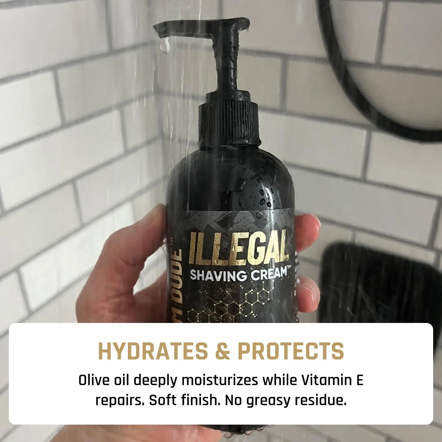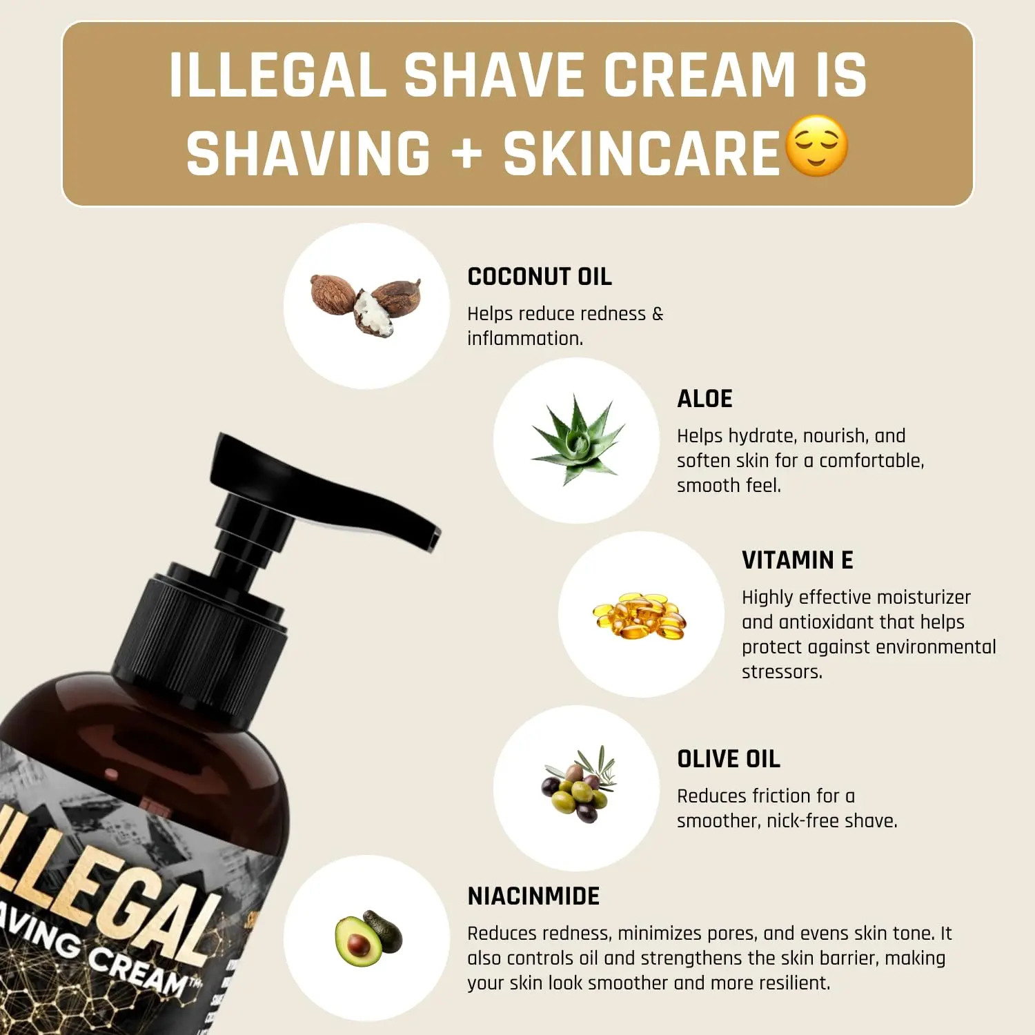 Save BIG with all 3 pack of our MAN-SIZE, 8 FL OZ, Illegal Shaving Cream. Enjoy the cleanest, closest shave with non-toxic, natural ingredients that soothe & nourish even the grizzliest dude’s skin with Aloe, Olive Oil & Vitamin E.
