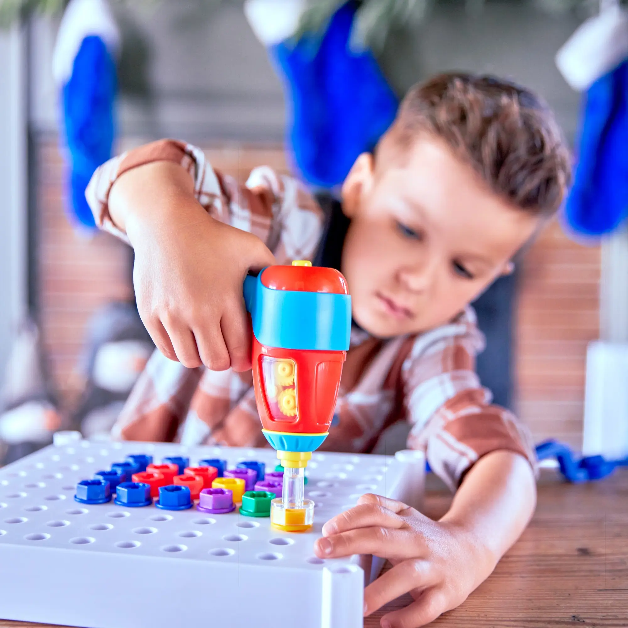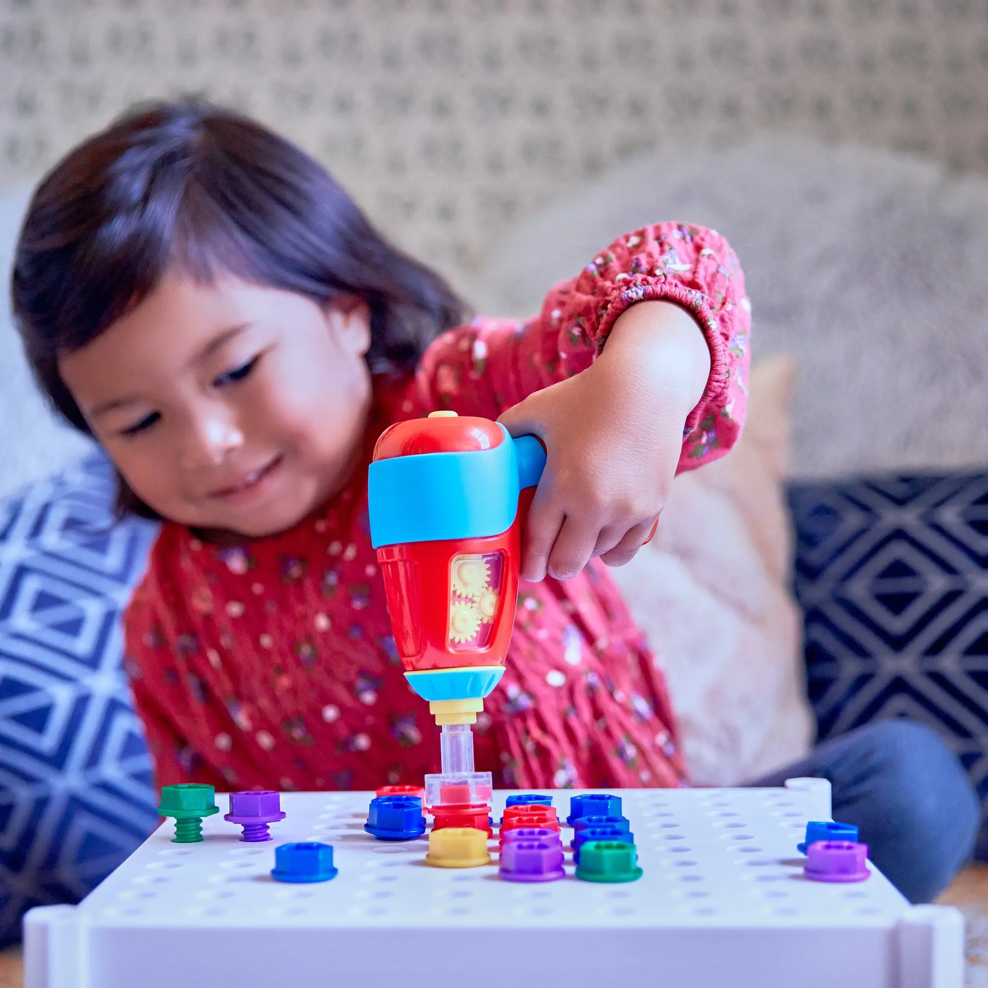 ·LET’S BUILD! Kids power up their imaginations and build coordination skills as they drill & play with a toy drill, and chunky, kid-sized bolts onto a sturdy activity board