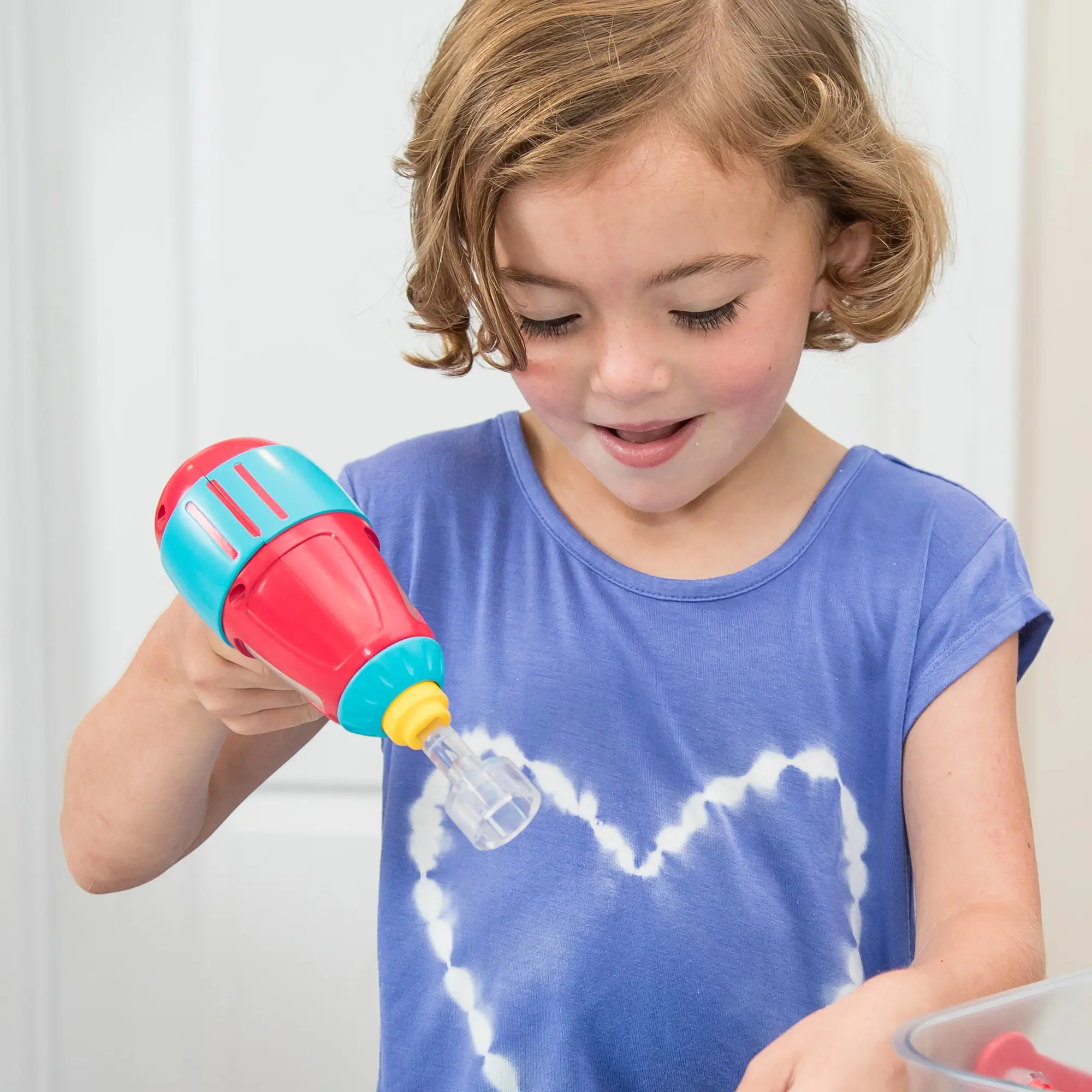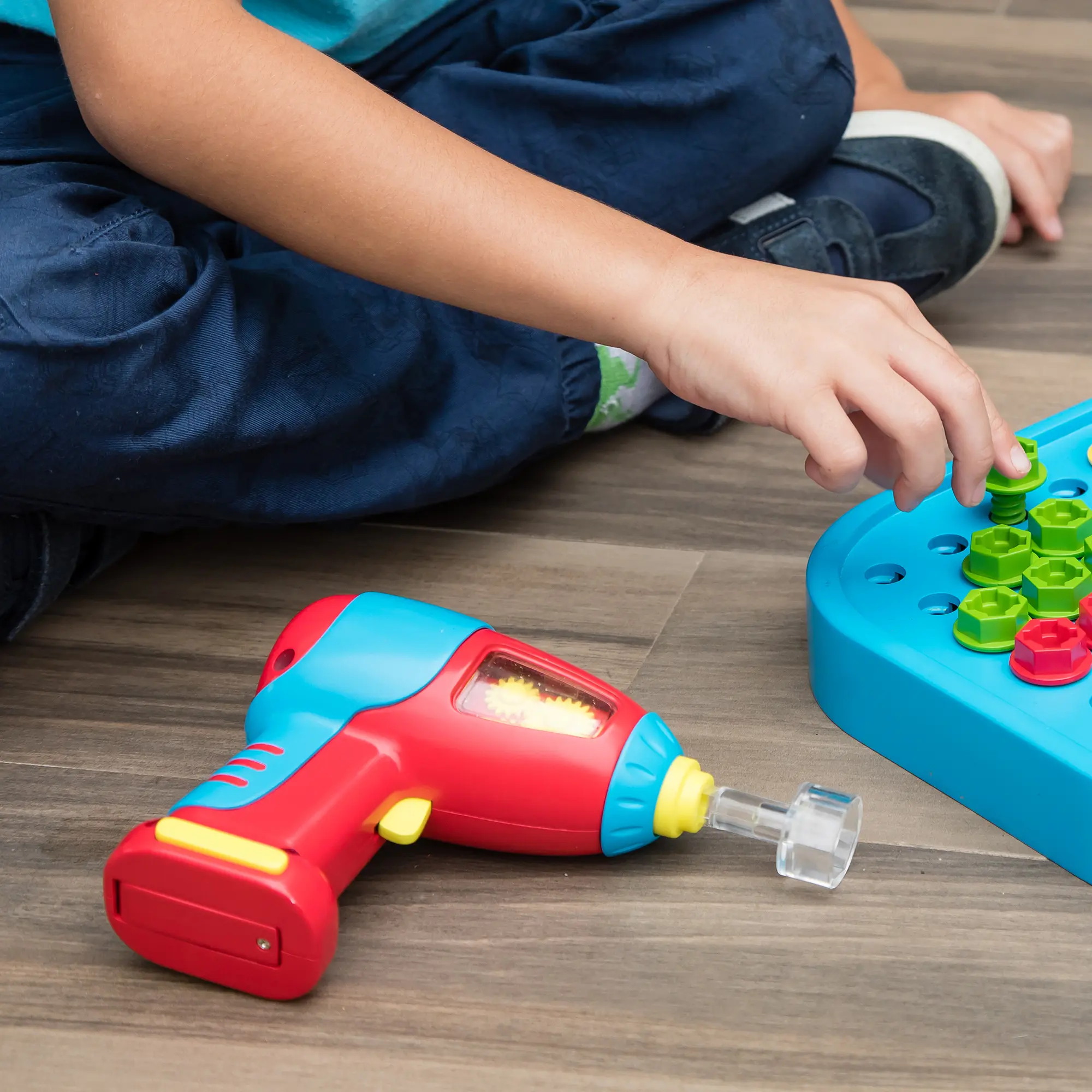 ·FEATURES: Chunky, kid-safe power drill with forward and reverse settings, power button, and clear drill bit. Drill requires 3 AAA batteries (not included). Drill Patent No. US D929,837