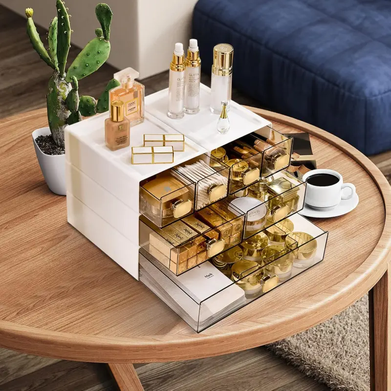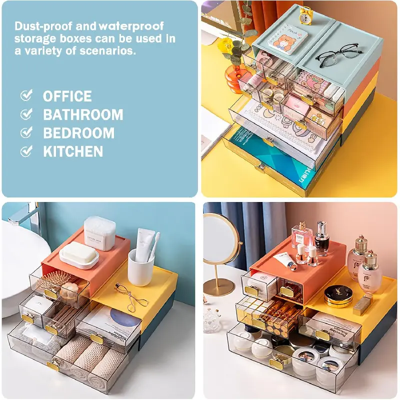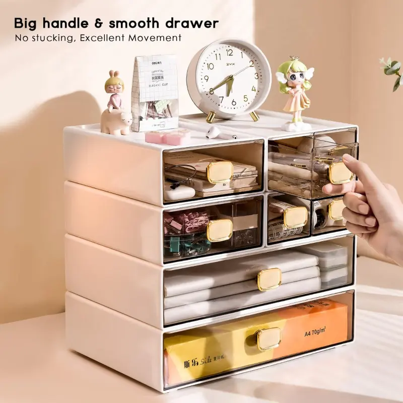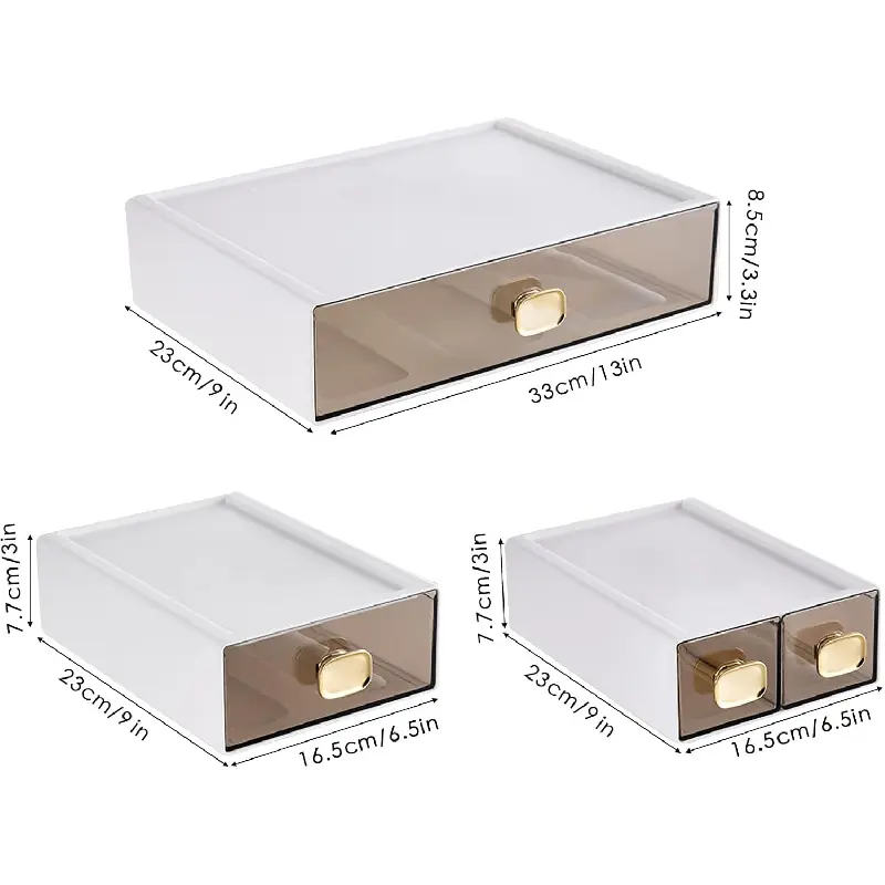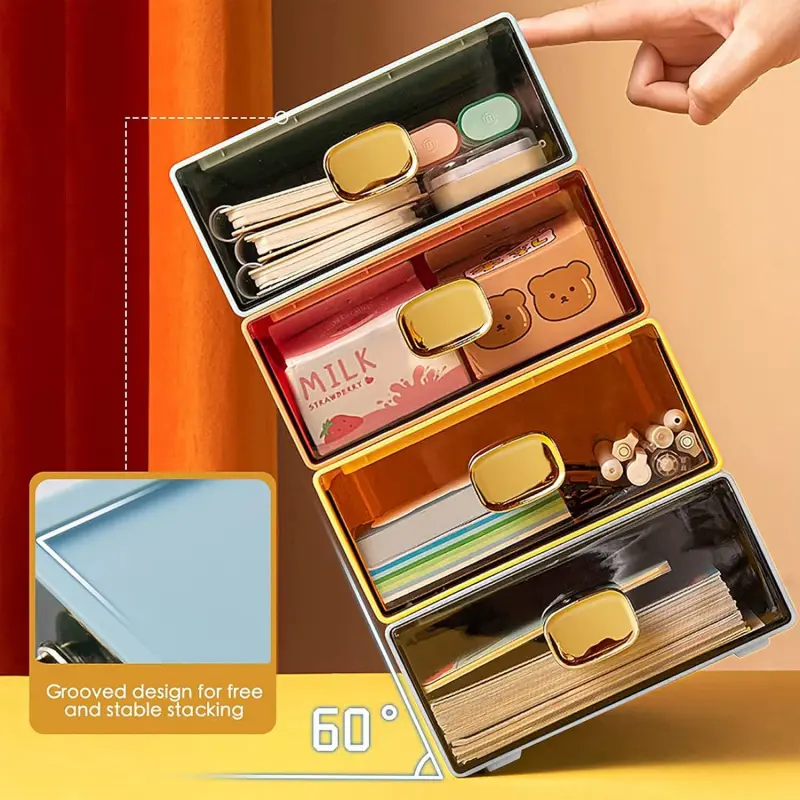[Stackable and Stable] This desktop storage box has a modular design for easy combination and stacking.The top of each box is recessed, and there are 4 non-slip feet at the bottom, so that each box can be stuck on the box below.This ensures that the drawer can be pulled out and pushed in smoothly and the box will not wobble.