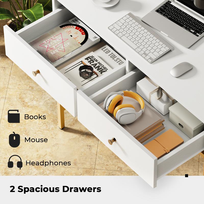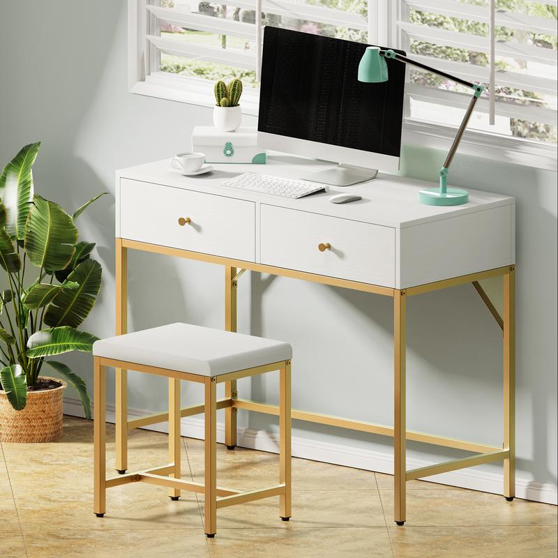 5. SUPERJARE 35.4" White and Gold Desk with 2 Drawers, Modern Makeup Vanity Desk with Padded Stool, Small Computer Desk Home Office Desk for Writing Study Bedroom