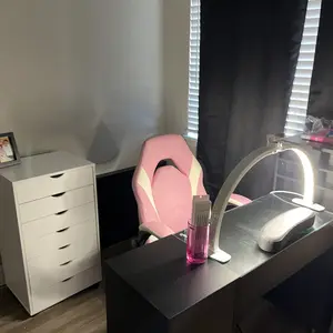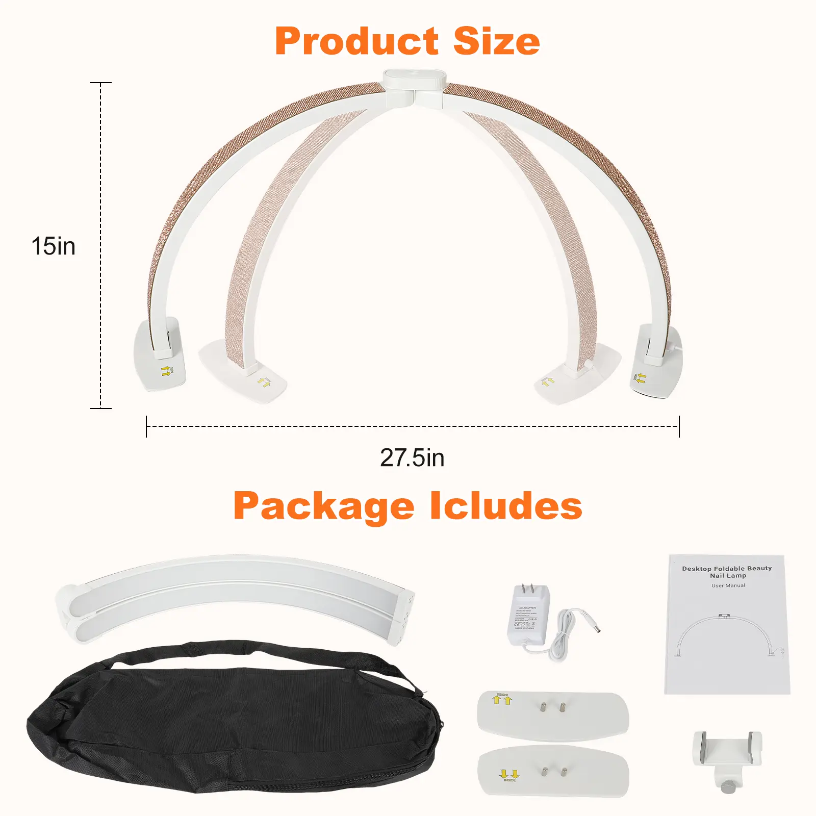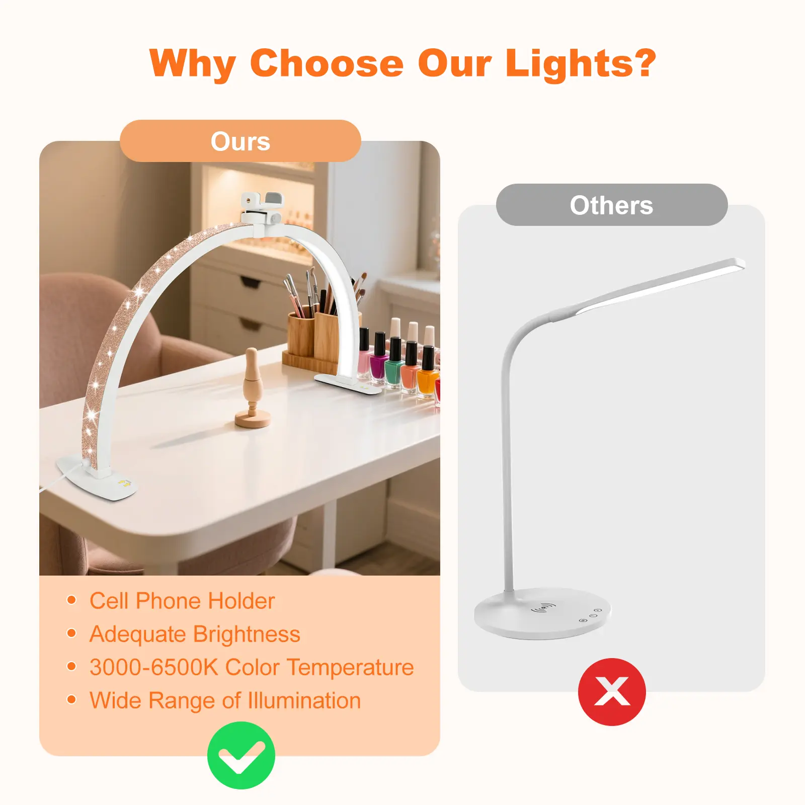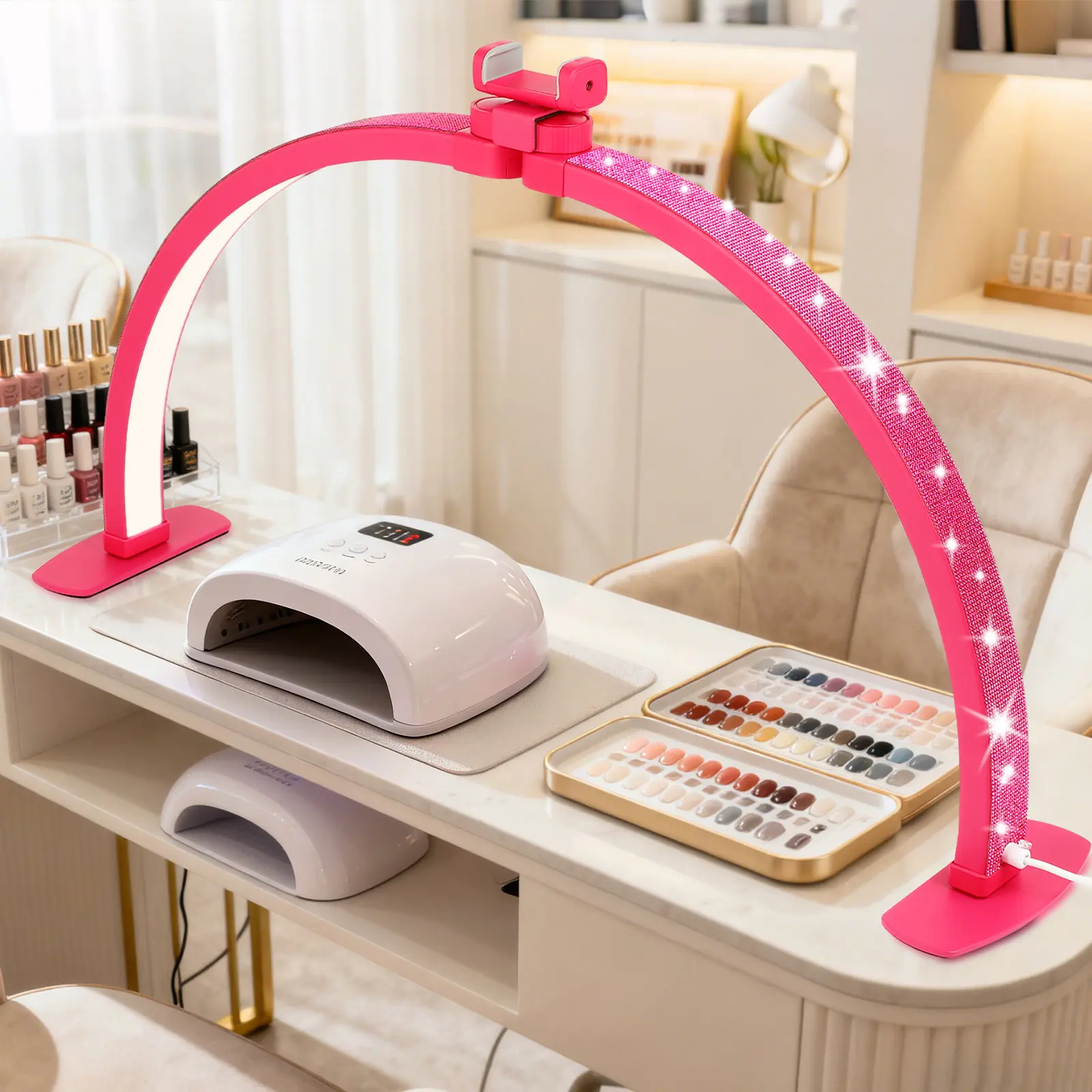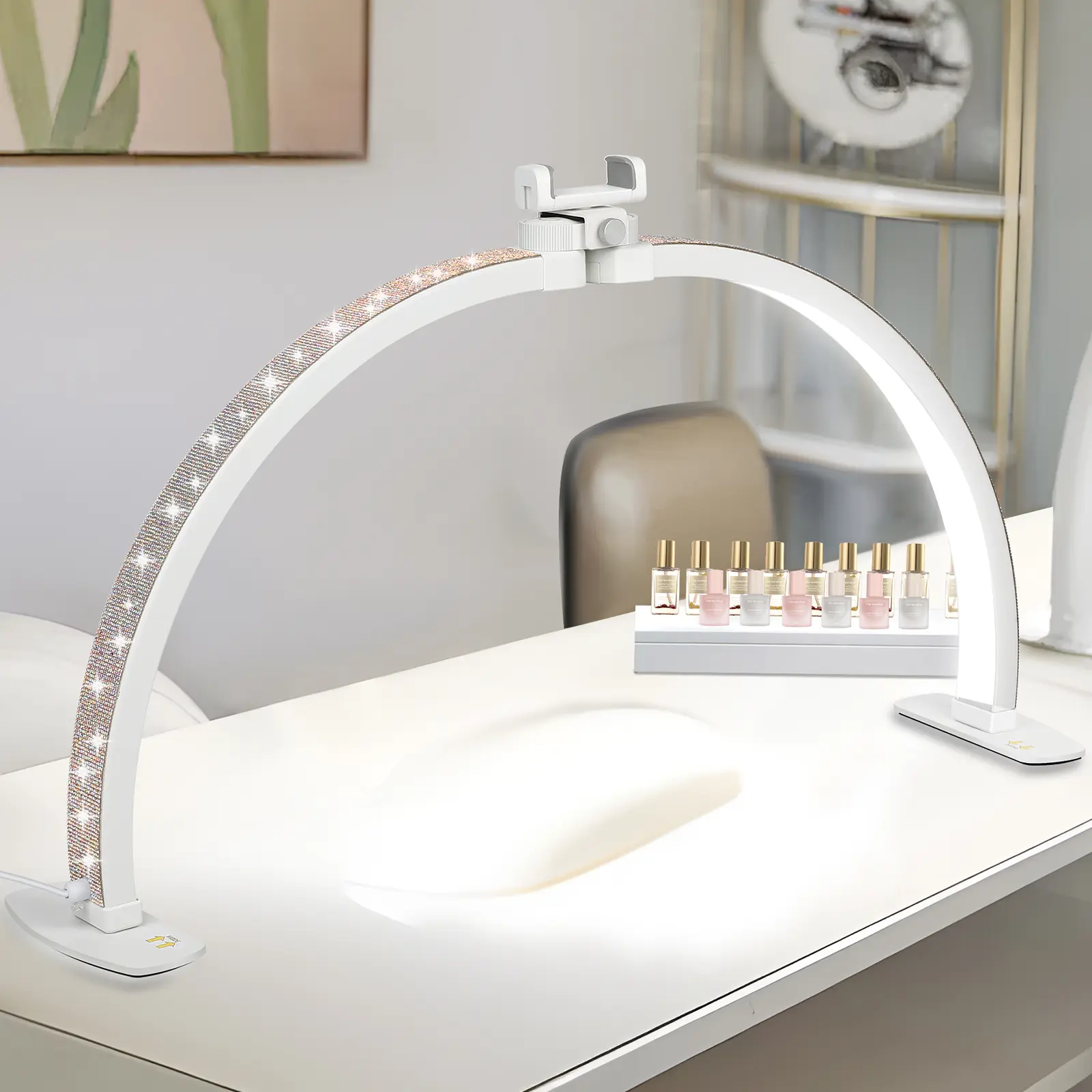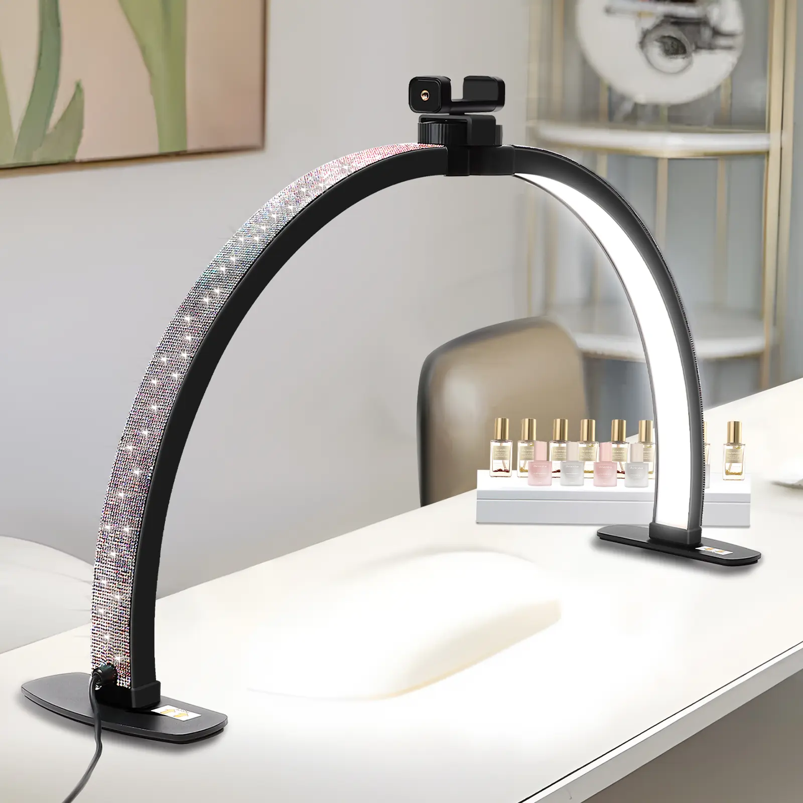 Love it!! Fits great on my nail desk, the feet don’t take up much room. The lighting is bright on all modes, the rhinestones are beautiful. They sparkle so much, just alil tacky. The phone attachment is nice, has great pov. The cord is long but not long enough for my liking, I get tripped up on it.