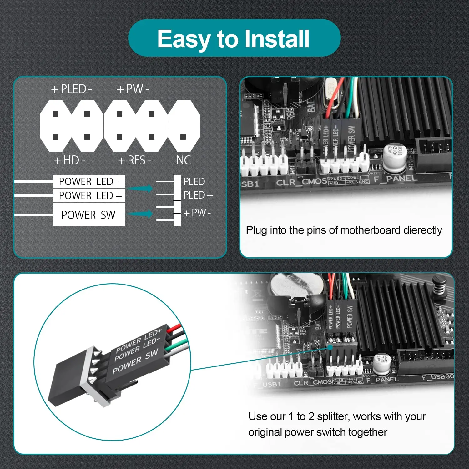 Easy to install by and Sticker: Please check the installation instructions product description. Just connect the POWER LED+, POWER LED-,POWER SW connectors with motherboard and stick the adhesive plate or use the the right place.