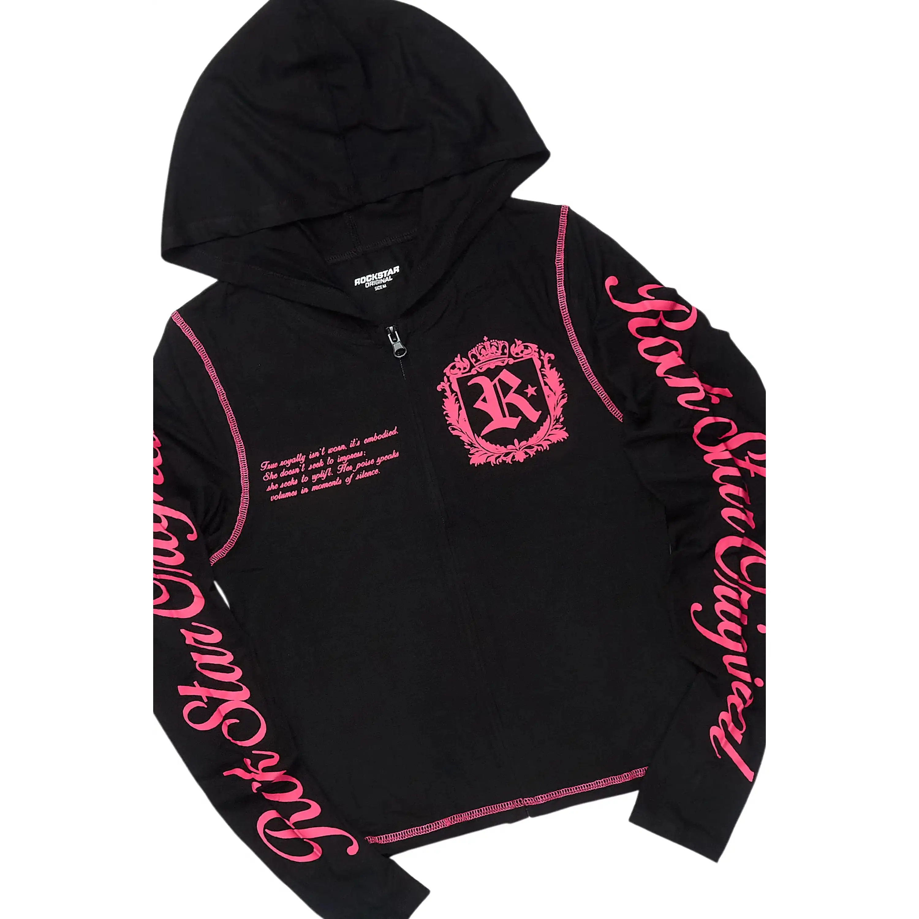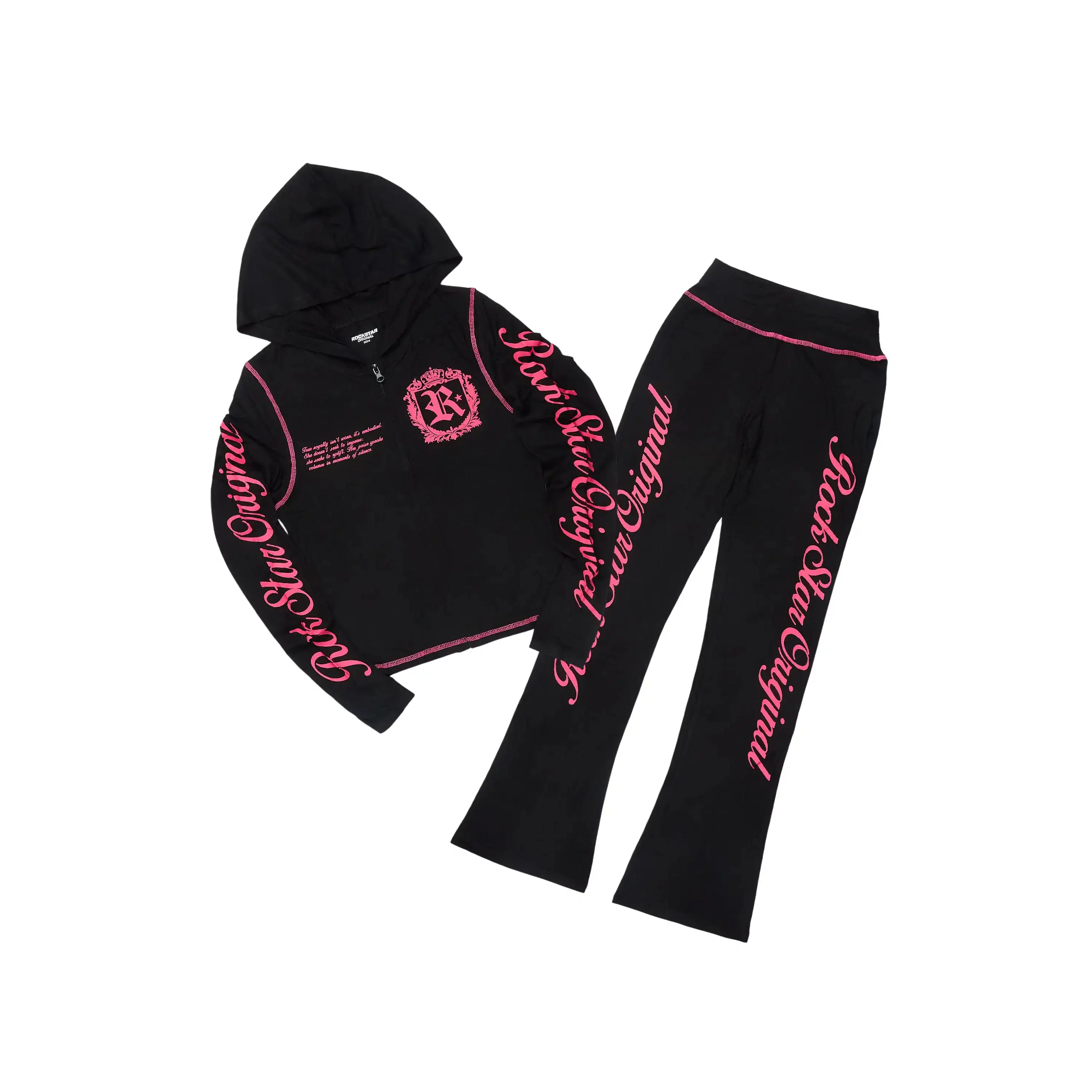 An urban two-piece zip-up jacket and lounge pant set for women in black. Designed with an ultra soft fabric for a must-have streetwear set.