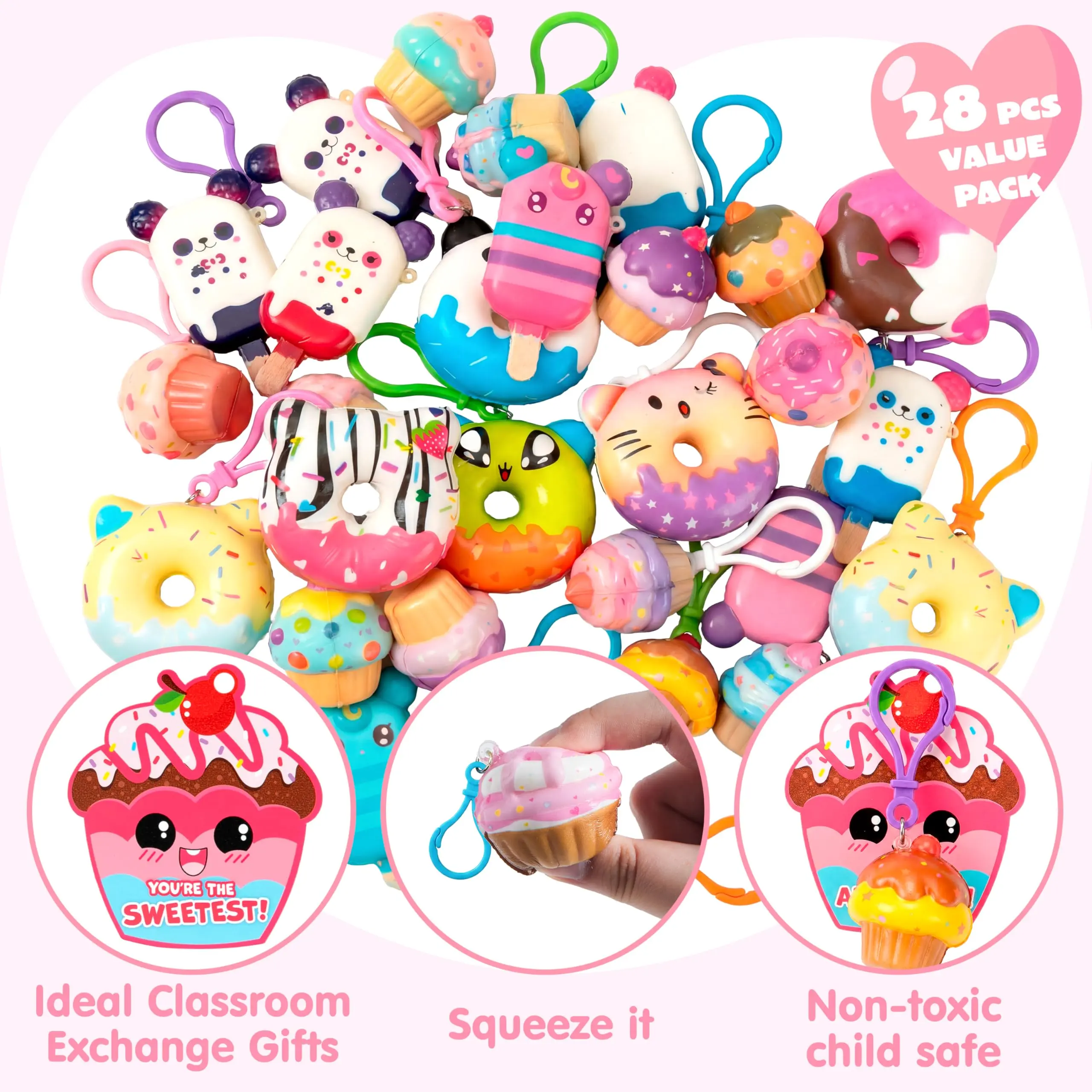 ·The set includes 28/30 assorted desserts-themed slow-rising squishies. Children will delight in playing with our Desserts squishy toy Toys accompanied by Cute Valentines Cards, making them ideal Valentine notes for boys and girls.