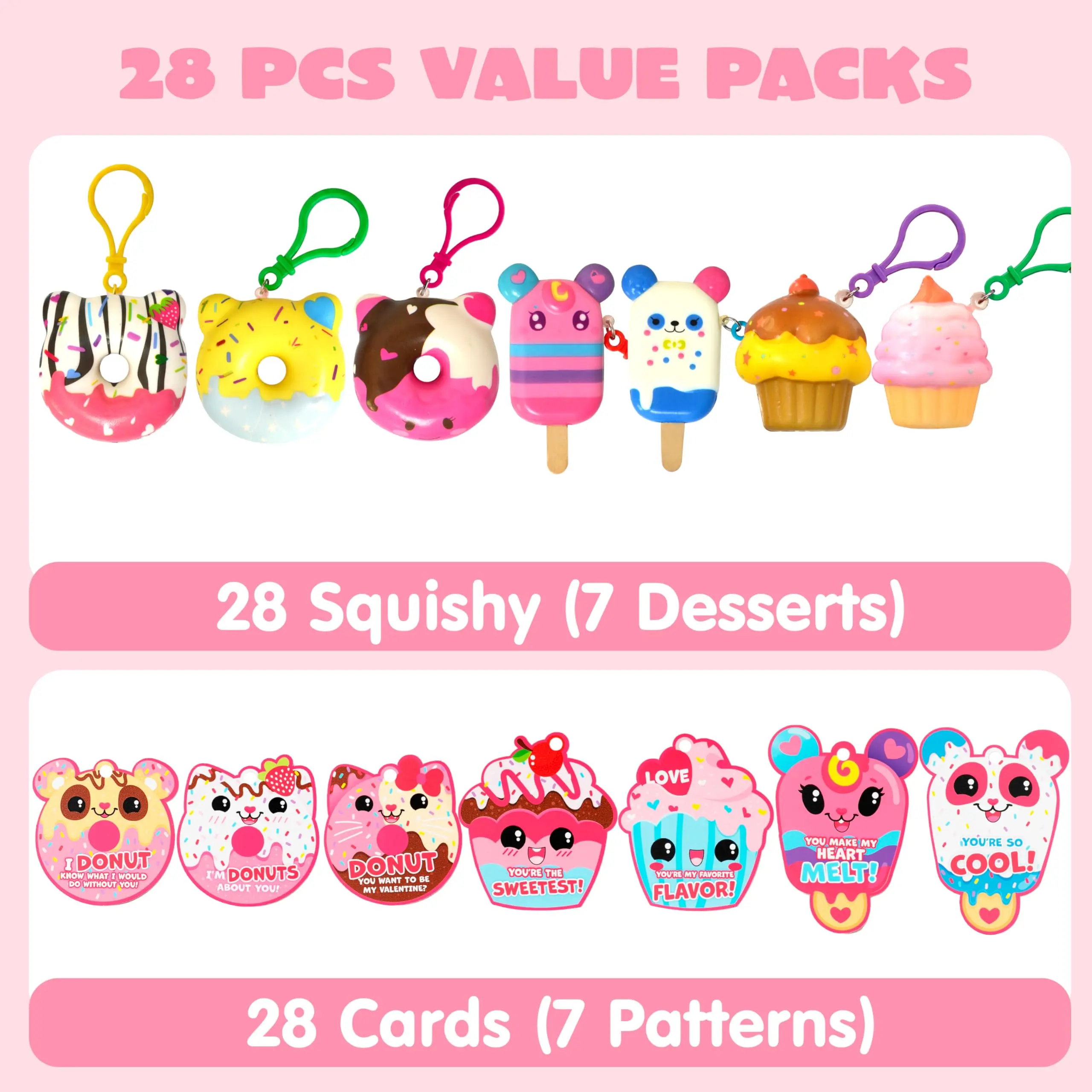·28Pcs Dessert Squishy: Our Valentine Desserts squishy toy Toys Set comes with 28 Valentine’s cards featuring cute and humorous messages that uniquely complement the theme of the set, along with 28 Dessert squishy toy Toys. The measurements are 2.75 x 2.75 inches for Donuts, 2 x 3.5 inches for Popsicles, 2.25 x 2 inches for Cupcakes, and 3 x 3-4.45 inches for the cards.