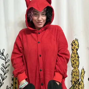 This onesie features a pointed hood with black devil horns and a little heart tail. Black front heart pockets as well as side pockets.