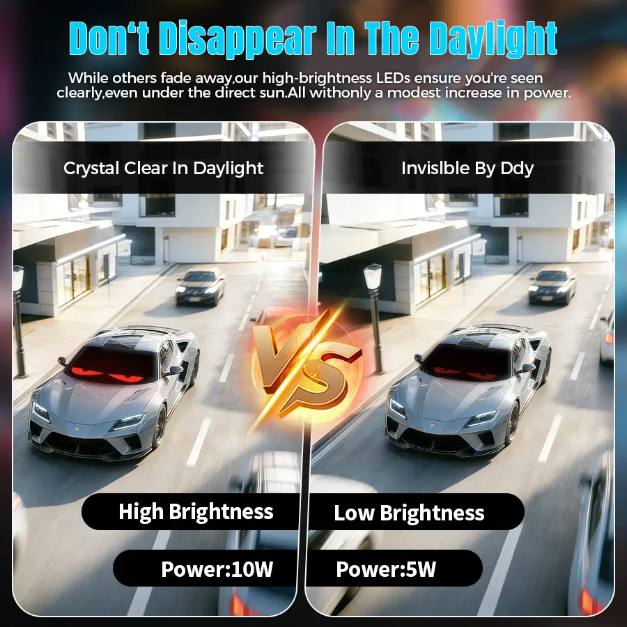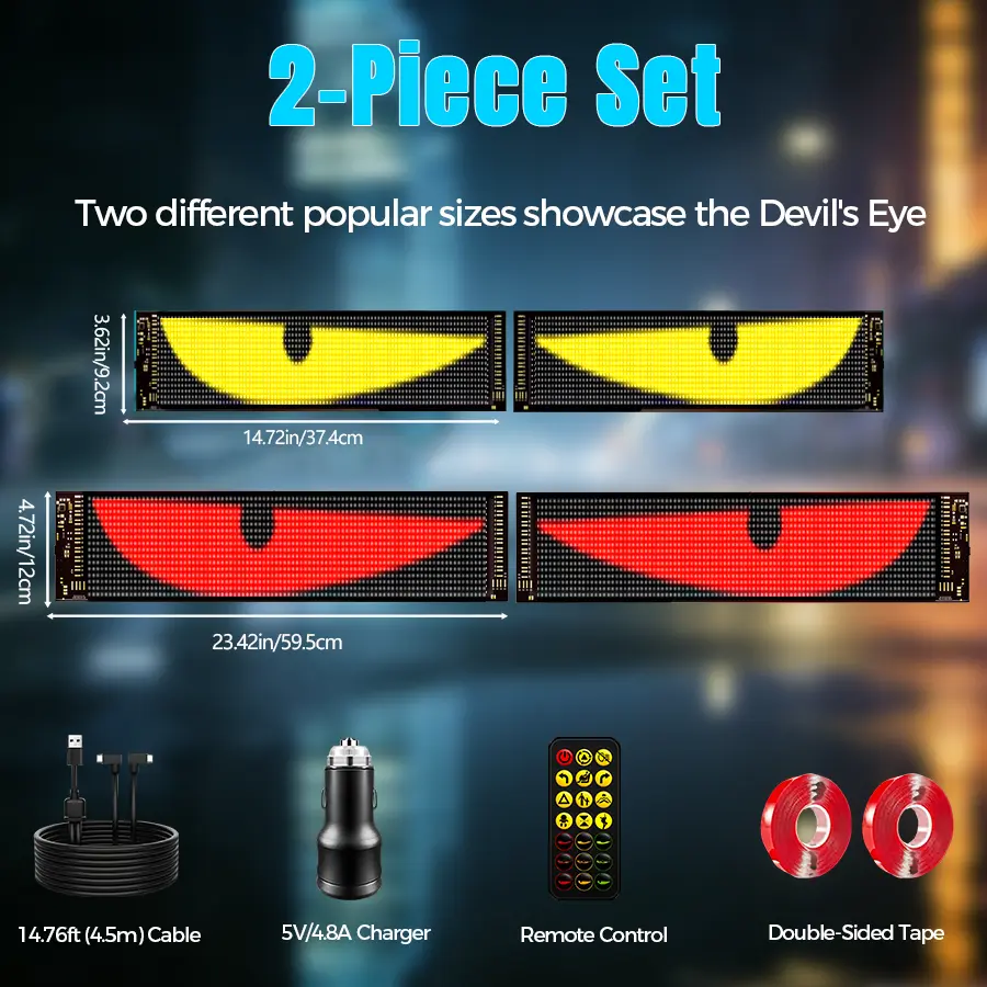 ·ăEasy Installation, Plug & PlayăThis devil's eyes light for cars is equipped with a super-strong adhesive tape - sticks securely to truck windshields (perfect for eye lights for car windshield), bedroom walls, or bar counters! In addition, the 4.5M ultra long power cord and 5V USB upgrade plug are designed to leave enough space for your flexible LED digital display. As long as you plug in the power and turn on the switch, the LED car eyes will immediately light up.