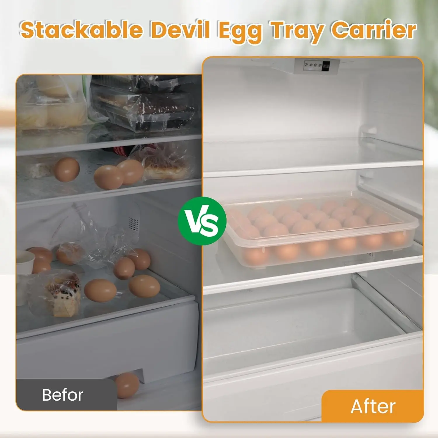 Practical Kitchen Storage: This egg holder for fridge is for deviled egg platters or storing up to 24 regular eggs. Keep your eggs secure and in your refrigerator egg organizer, eliminating the confusion of traditional egg cartons