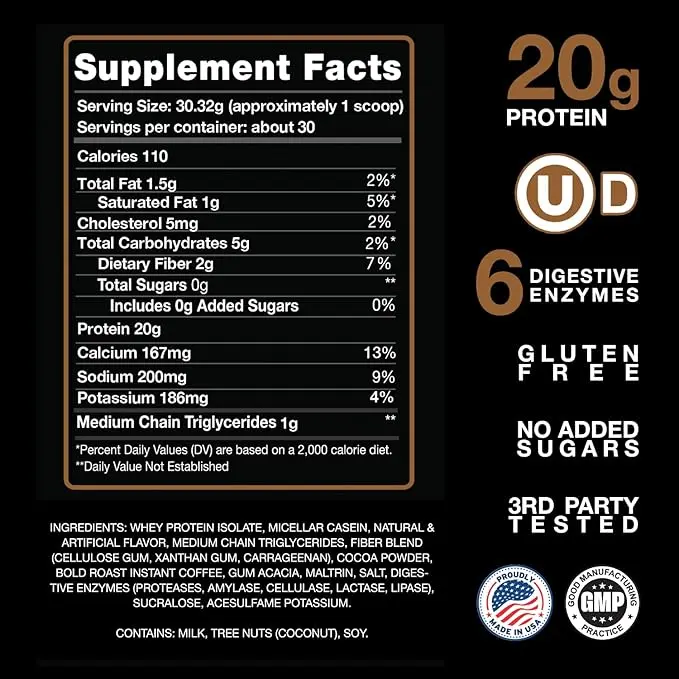 INGREDIENTS: Whey Protein Isolate, Micellar Casein, Digestive Enzyme Blend, MCT Oil, Natural & Artificial Flavors, Sweeteners (Sucralose).
