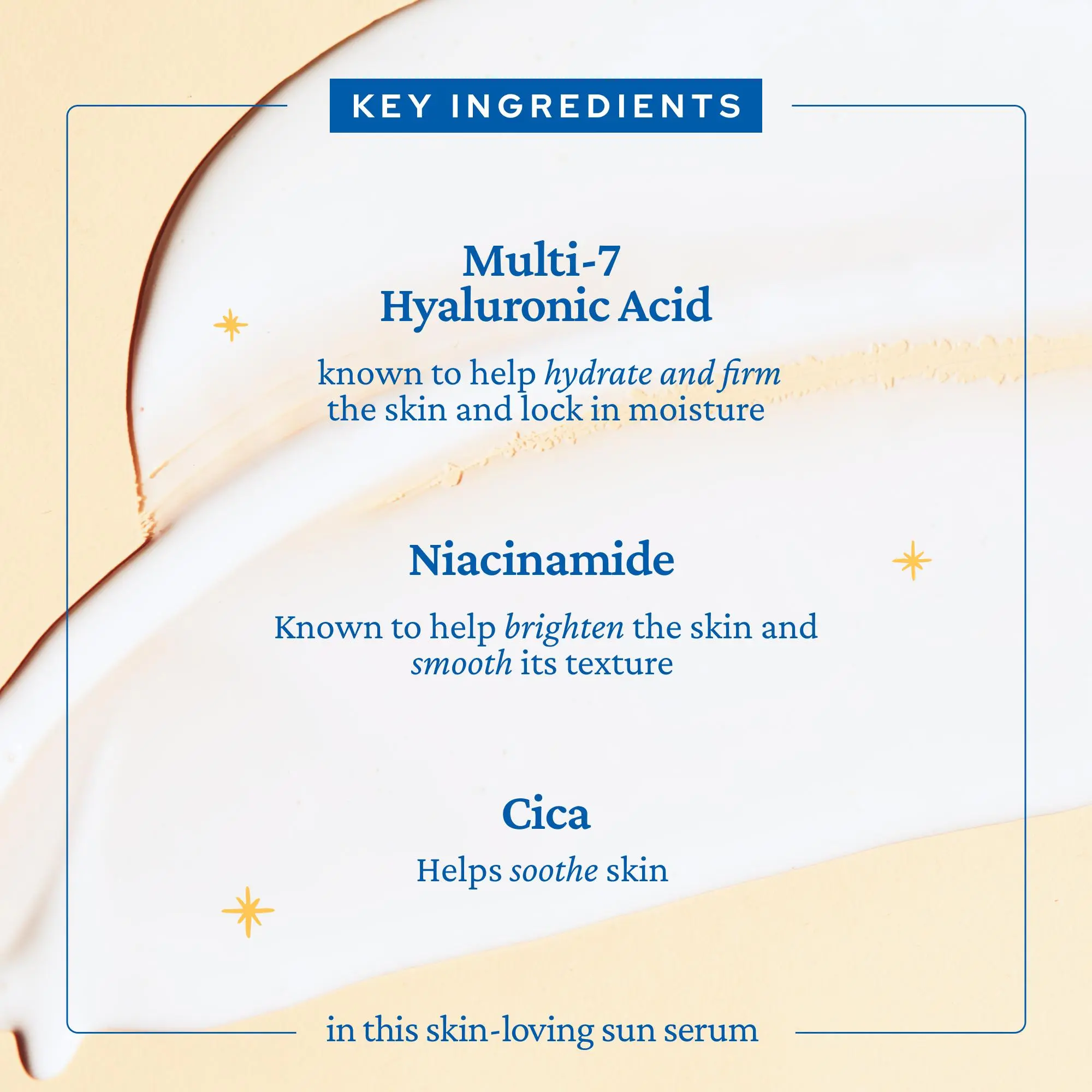 | Ingredients | Avobenzone (2.7%), Homosalate(9%), Octisalate(4.5%), Octocrylene(9%), Water, Dimethicone, Glycerin, Cetyl Alcohol, Dipropylene Glycol, Potassium Cetyl Phosphate, 1,2-Hexanediol, Panthenol, Glyceryl Caprylate, Isododecane, Glyceryl Stearate, Niacinamide, Caprylic/Capric Triglyceride, Acrylates/Polytrimethylsiloxymethacrylate Copolymer, Fragrance++, Cetearyl Olivate, Inulin Lauryl Carbamate, Sorbitan Olivate, Sodium Polyacryloyldimethyl Taurate, Tromethamine, Xanthan Gum, Magnesium Aluminum Silicate, Trisodium EDTA, Myristica Fragrans (Nutmeg) Extract, Melissa Officinalis Flower/Leaf/Stem Water*, Rosmarinus Officinalis (Rosemary) Leaf Water*, Madecassoside, Eucalyptus Globulus Leaf Extract*, Butylene Glycol, Sodium Hyaluronate+, Hydrolyzed Hyaluronic Acid+, Mentha Rotundifolia Leaf Extract*, Rosa Canina Fruit Extract*, Hyaluronic Acid+, Hydrolyzed Sodium Hyaluronate+, Hydroxypropyltrimonium Hyaluronate+, Sodium Acetylated Hyaluronate+, Thymus Vulgaris (Thyme) Leaf Extract*, Pentylene Glycol, Ecklonia Cava Extract**, Hizikia Fusiforme Extract**, Laminaria Japonica Extract**, Ethylhexylglycerin, Sodium Hyaluronate Crosspolymer+, Limonene, Citronellol, Geraniol, Linalool, Citral |