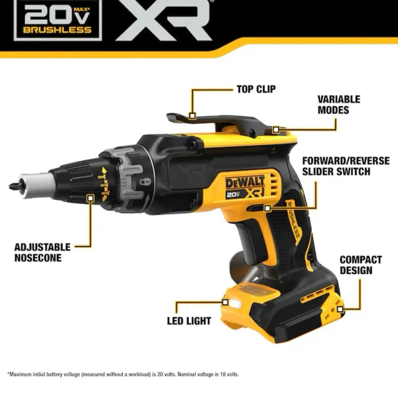 The DCF630 Brushless Drywall Screwgun features a brushless motor for efficient