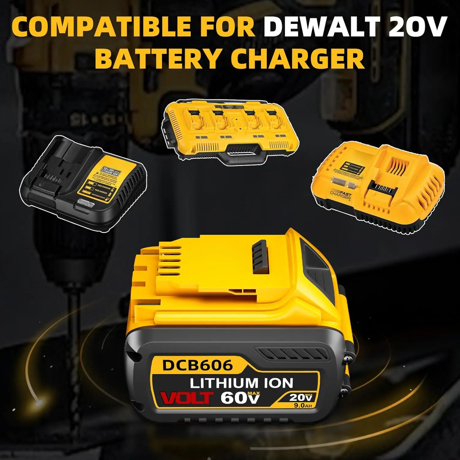 ·[Perfect Compatibility] This battery is a replacement for Dewalt 20/60V Battery DCB606 DCB609 DCB612 and 20V/60V Chargers, compatible with dewalt 20v60v power tools. Dual-voltage technology automatically adjusts the battery to 20v or 60v, it delivers the same power and reliability as original 20V and 60V batteries.