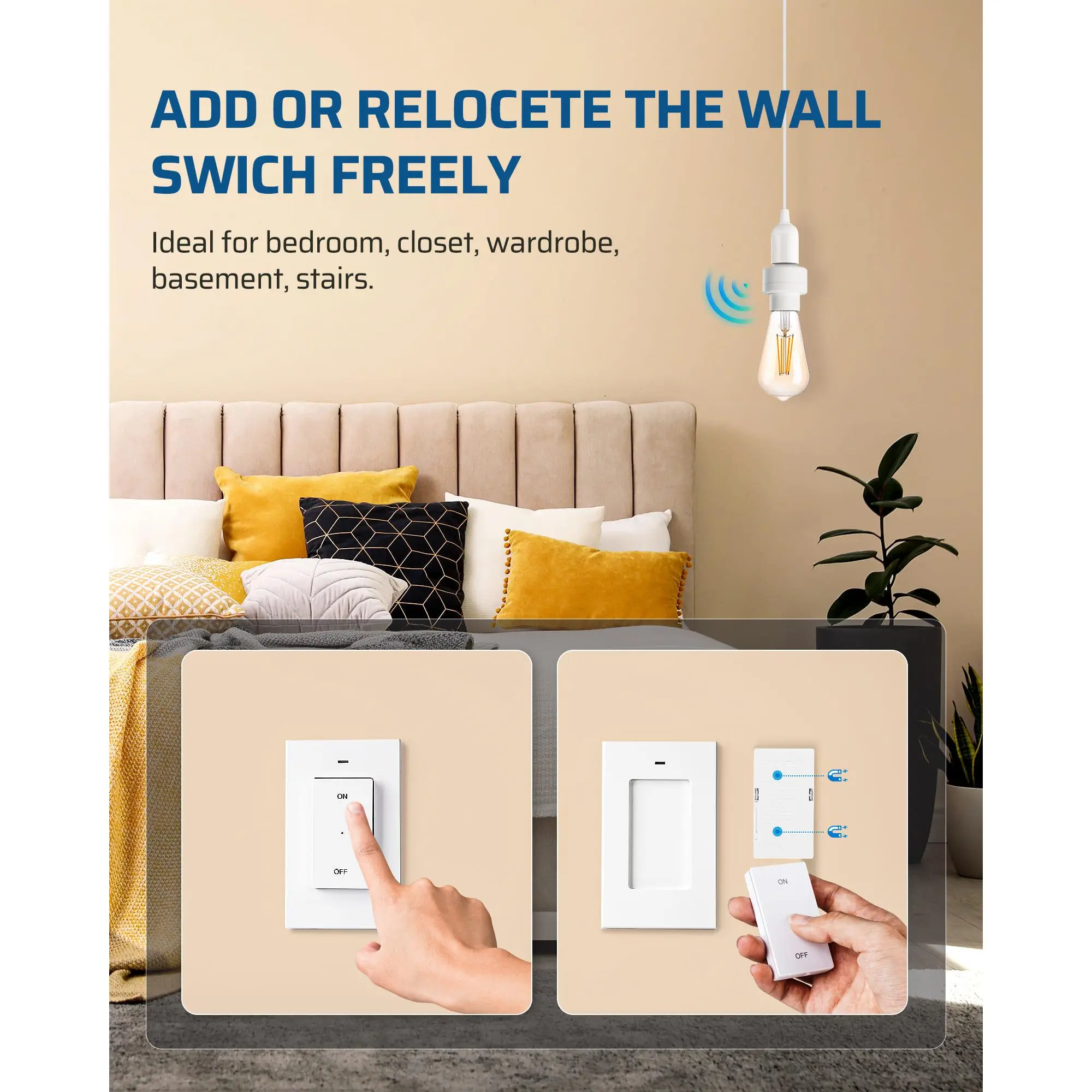 【Programmable & Expandable】This Wireless Light Switch and Receiver Kit offers programmable control for multiple devices. Activate multiple devices with 1 switch or control 1 device with multiple switches. Control all your lights anytime, anywhere with a compact size that won't affect the lighting design. More durable than remote control bulbs.