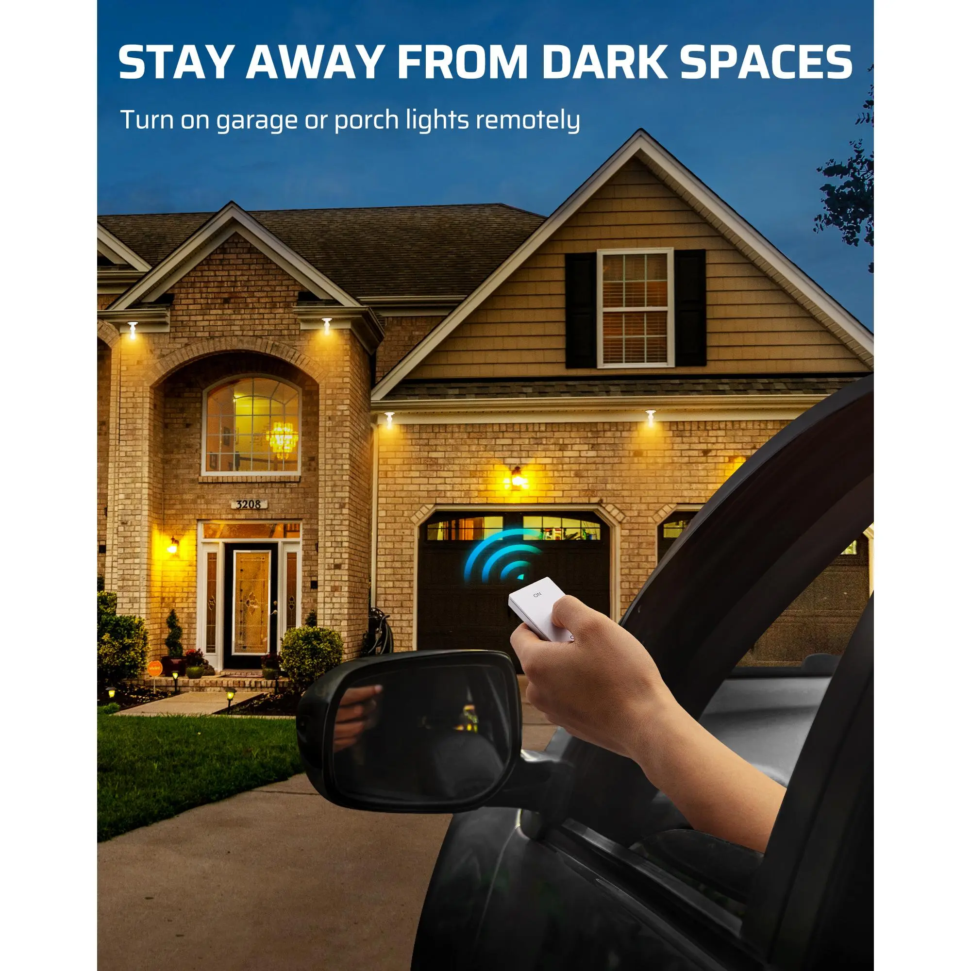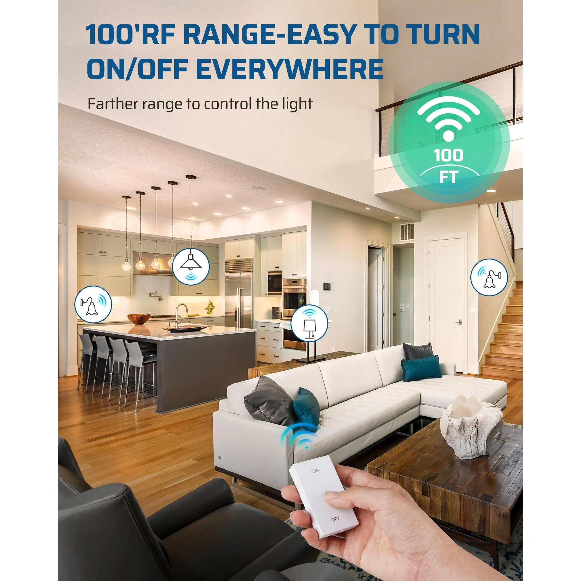 【100 FT Longer Remote Range】This Wireless Light Switch covers 100 FT with strong RF signal. Control lights from bed or couch without stumbling through the dark. Works through walls/doors without interference. Control garage, porch, stair, and basement lights more conveniently.