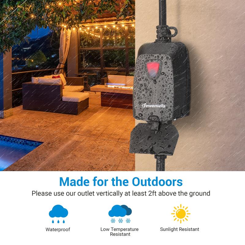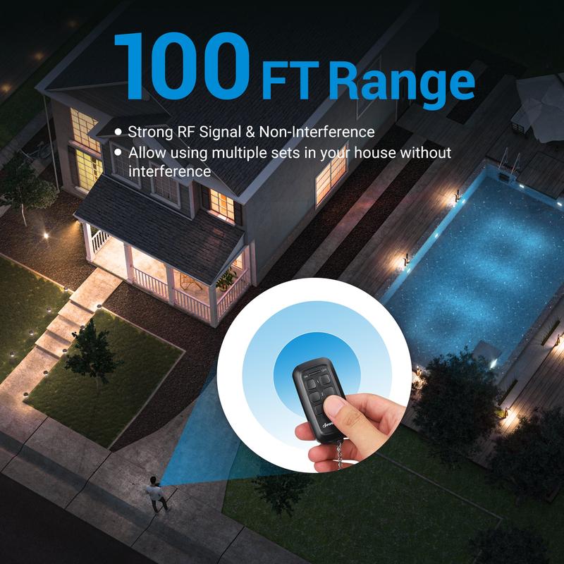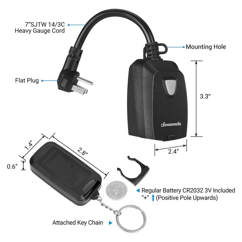 【MAKE LIFE EASIER】DEWENWILS Remote Control Switch allows you to remotely turn on and off garden lights, light strings, fountain pumps, sprinklers, lighting fixtures, and other electrical appliances with just one button. It's easy to set up and use, with plug-and-play functionality and a CR2032 3V battery included, saving you time and hassle. 【STRONG RF SIGNAL】This Wireless Remote Outlet works without interference through walls and doors, with a range of up to 100 feet in open areas. It doesn't require line-of-sight between the remote controller and receiver, giving you flexibility in placement and use. The remote controller has a key ring for easy storage and access. 【NON-INTERFERENCE & HASSLE-FREE】Unique advanced technology eliminates self-interference and interference with existing RF remote control systems, eliminating the need to worry about duplicate frequencies or affecting your neighbors' lights. Effortlessly control household appliances from inside or outside your home without interference. 【PROGRAMMABLE & EXPANDABLE】This Remote Outlet Switch is pre-programmed for immediate use, but you can add extra Dewenwils remotes and remote control switches (same model only) to expand your remote system or customize the combinations according to your specific needs. 【WEATHER RESISTANT CONSTRUCTION】This Indoor and Outdoor Wireless Remote Outlet features a waterproof cap to protect your device against dirt and water. It's made of durable and sturdy PC material that's weather and abrasion-resistant. The outlet is rated up to 15A / 1875W resistive, 1000W tungsten, and 1/2HP, making it suitable for a wide range of devices. ETL and FCC certified for your safety and peace of mind.