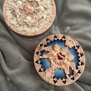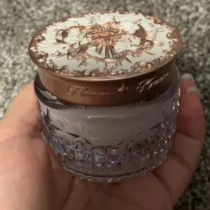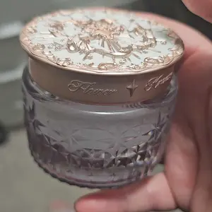 Jar is made of glass- not plastic, and is quite heavy. The facets on the side catch the light and sparkle, and the lid is super detailed and pretty as well. It comes with a pretty decent amount of product and it gets the job done nicely.