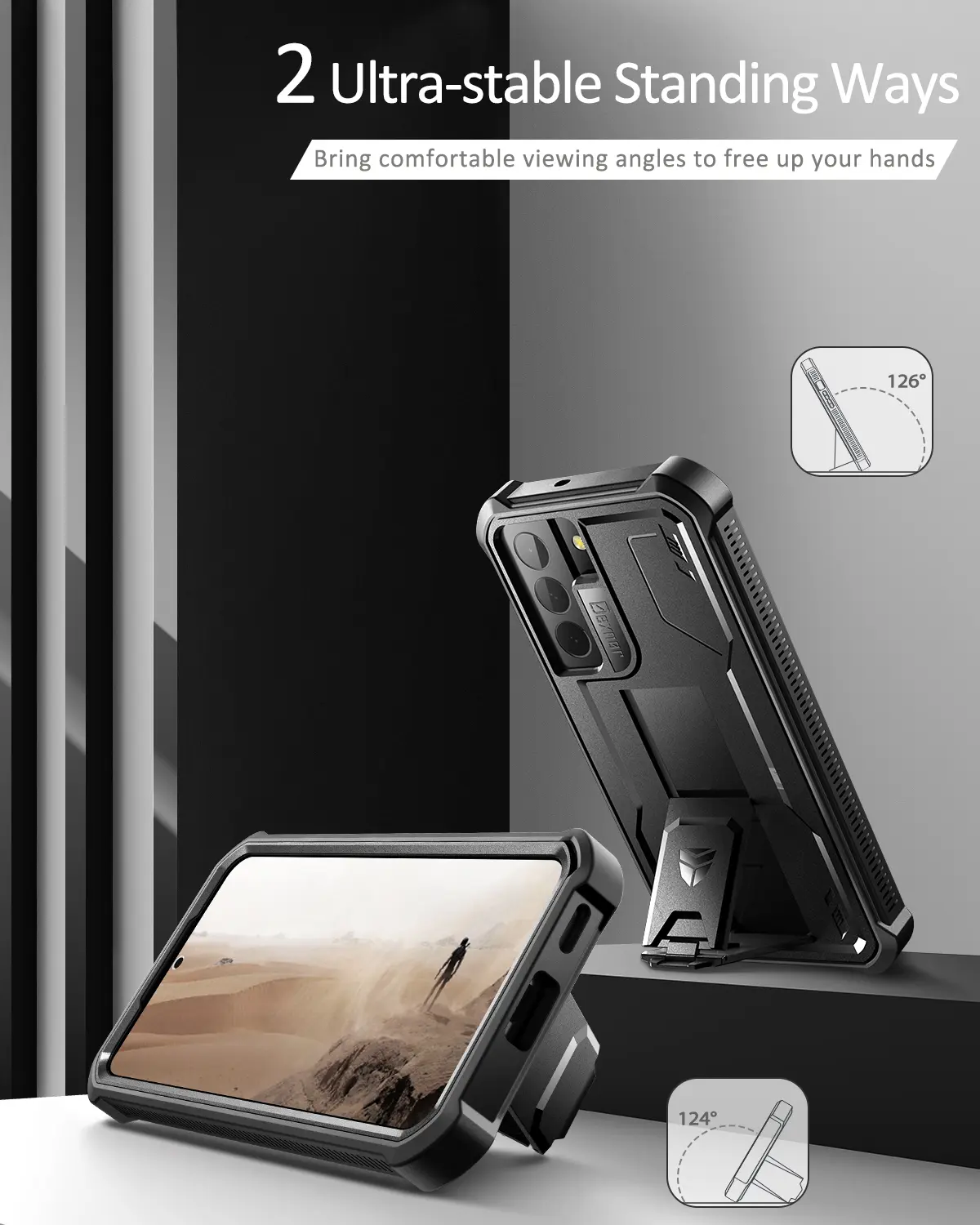 ·【For Galaxy S22 Plus Case with Kickstand】This for Samsung S22 Plus cover built-in kickstand as a ring holder sets your hands free while you watch YouTube and video. Convenient hands-free viewing from either landscape or two different angles of portrait mode.